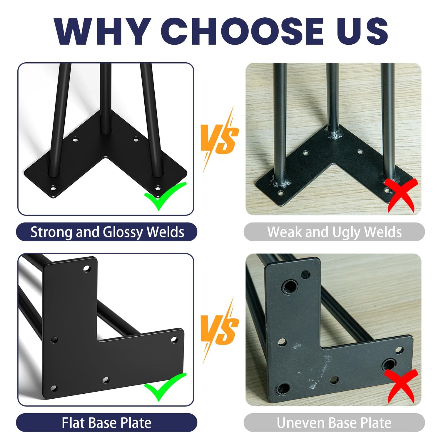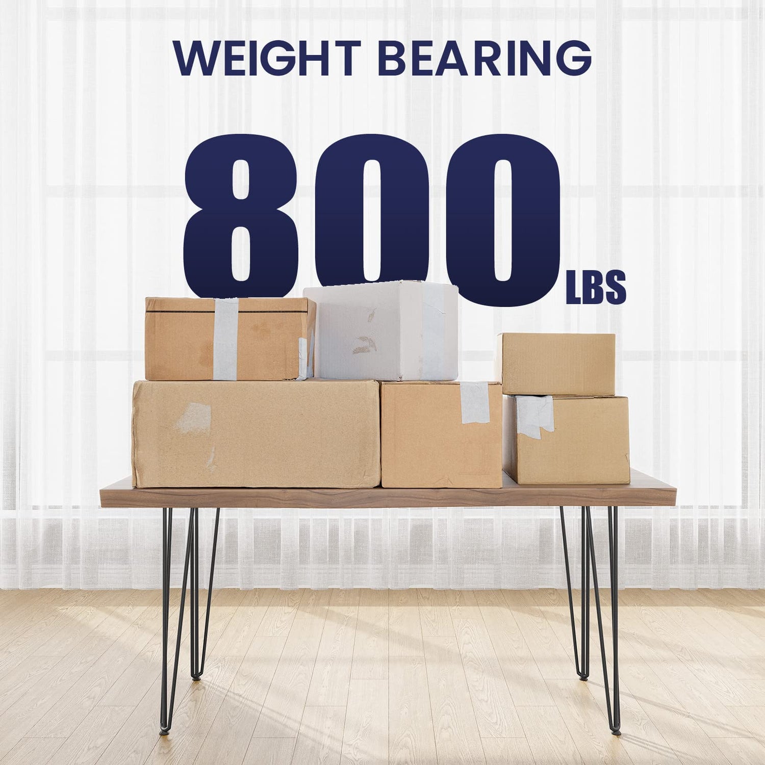 - Made of Steel: These hairpin legs are made of 1/2 inch pipe diameter cold rolled sturdy steel. The heavy-duty table legs come with the black powder-coated finish. Four legs will support up to 800lbs.