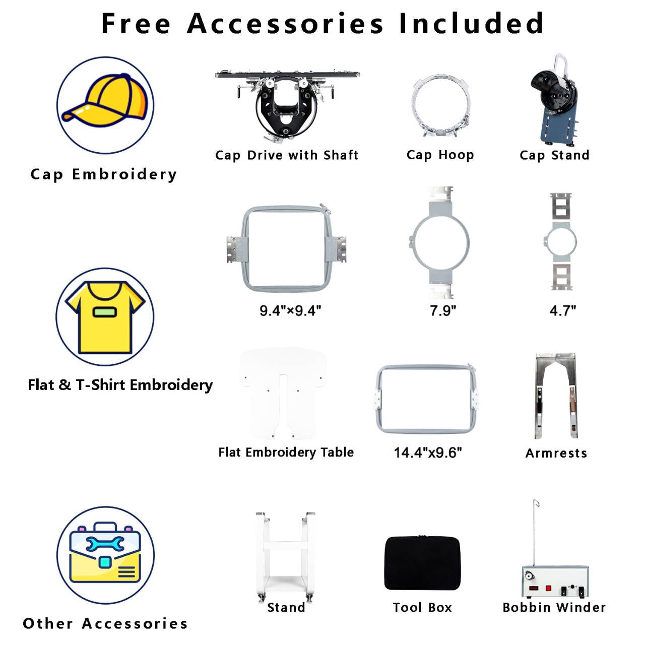 - Full Embroidery Application with Starter Pack: S-1001 commercial embroidery machine can stitch on denim, canvas, leather, vinyl, caps, shoes, bags and anything an industrial machine can stitch on by DST/DSB files from your computer to the machine with the USB/WiFi. The starter pack comes with our machine including machine embroidery threads, stabilizers and bobbin threads.
