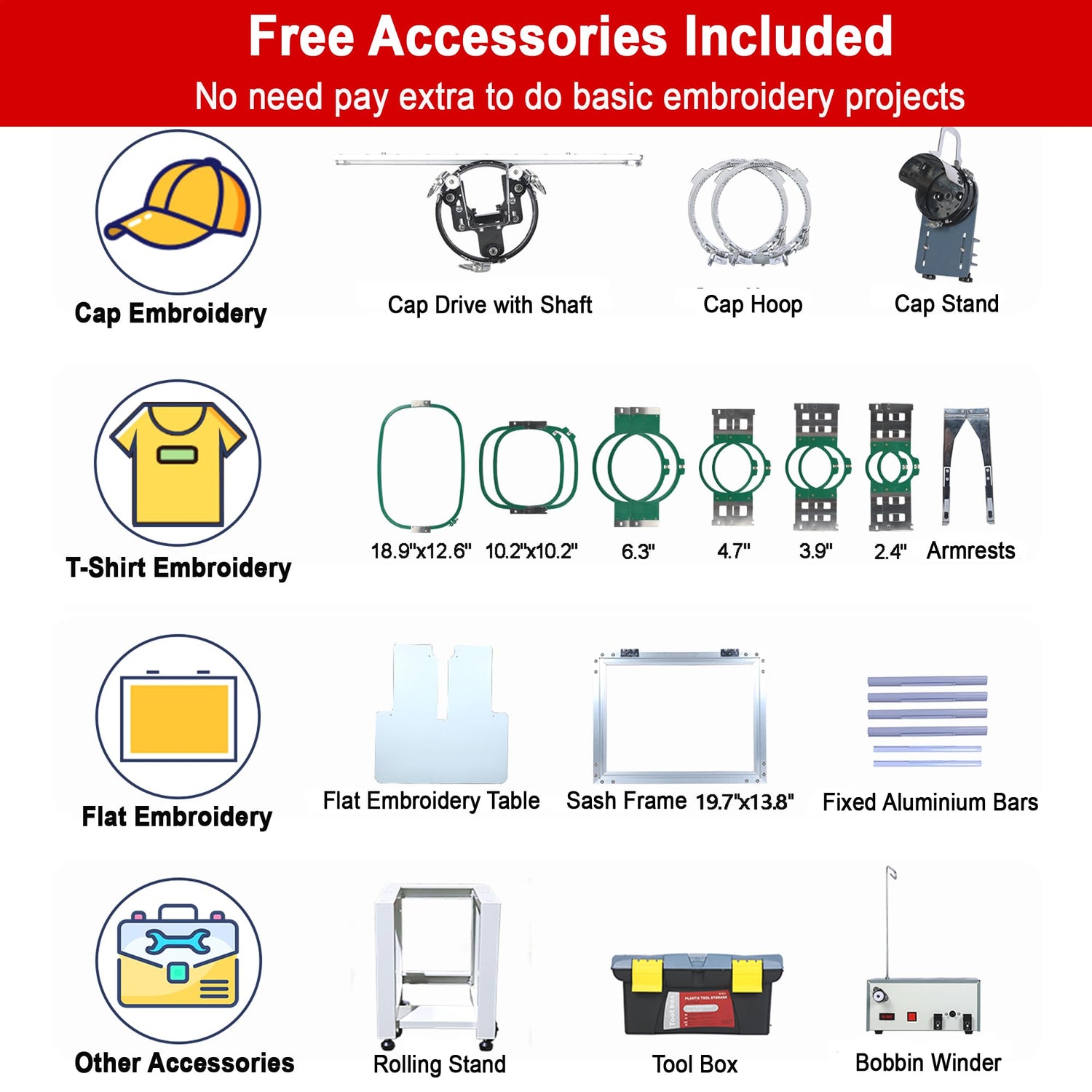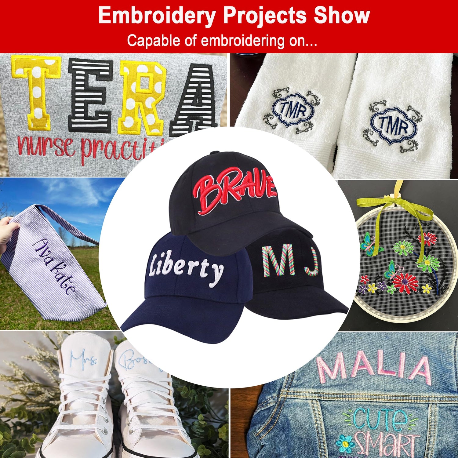 - ★ Full Embroidery Application with Starter Pack: S-1501 commercial embroidery machine can stitch on denim, canvas, leather, vinyl, 3D caps, side of caps, shoes, bags and anything an industrial machine can stitch on by DST/DSB files from your computer to the machine with the USB/WiFi. The starter pack comes with our machine including machine embroidery threads, stabilizers and bobbin threads.