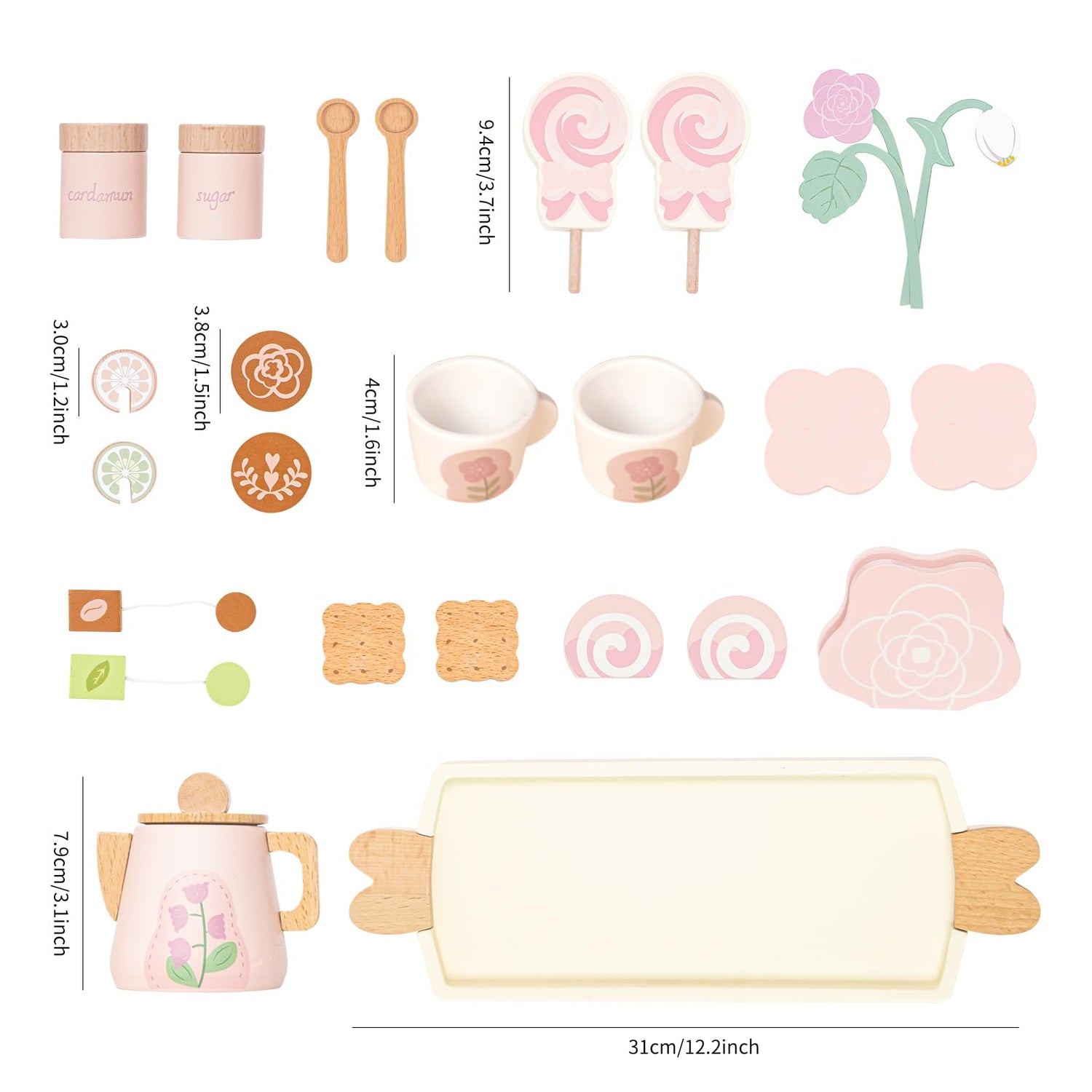 Smartwo Wooden Tea Set for Little Girls, 26 PCS Play Kitchen Accessories for Toddlers Princess Tea Party with Play Food, Pretend Play Tea Set Toy for Kids 1 2 3, Improve Imagination and Social Skills