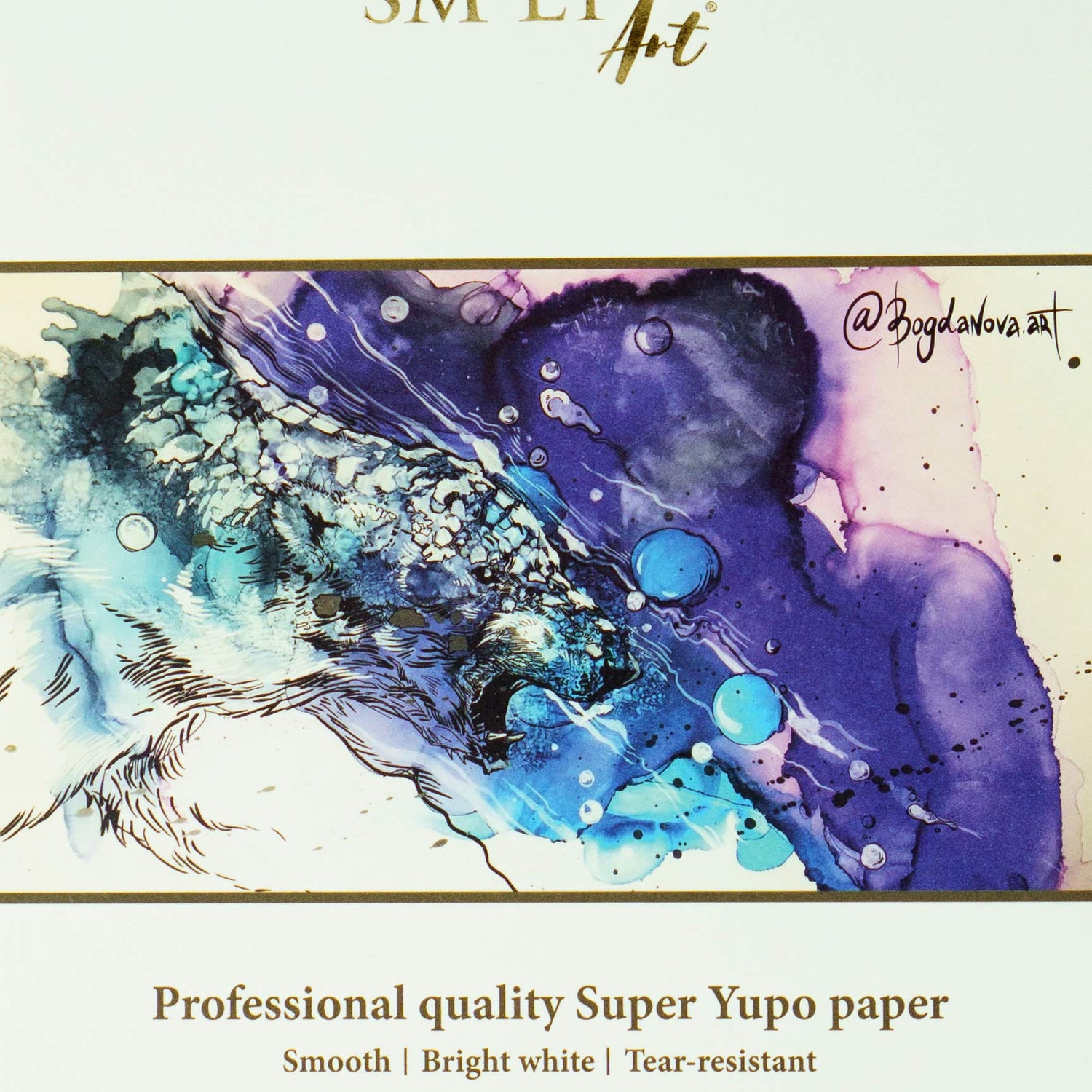 Details: A4 Super Yupo Sketch Pad PRO "SMLT ART", 10 Sheets. Glued with cover hard back. Smooth, glossy white, tear-resistant, synthetic, quick drying, UV light resistant luxury paper. It can be used on both sides, paper is beedproof. Best for markers, alcohol ink, rubbing alcohol, watercolour and other techniques. Perfect for creative and classic work.