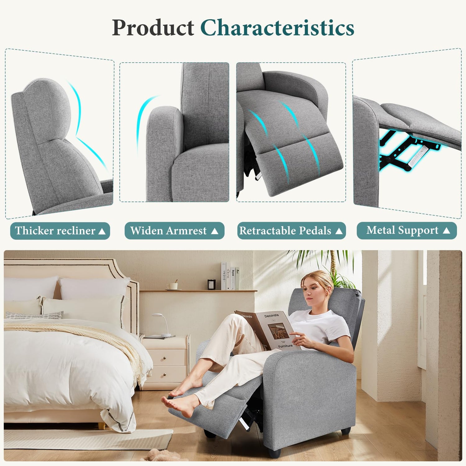 - 【Space-Saving Recliner】Maximize your living space with a compact yet spacious recliner that fits seamlessly into any room. The SMUG Recliner Chair offers a full reclining feature without occupying excessive floor area, making it ideal for small living spaces.