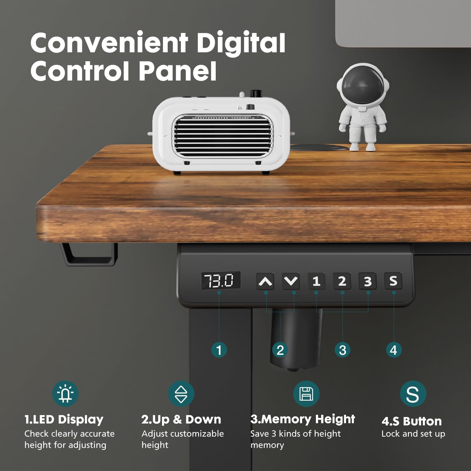 - Precise & Stable Adjustment: Designed to cater to your needs, our stand up desk design features an LED display and 3 memory presets, helping you make precise and quick adjustments. The robust wooden desktop and the T-shaped steel frame ensure maximum stability and can hold up to 176 lbs.