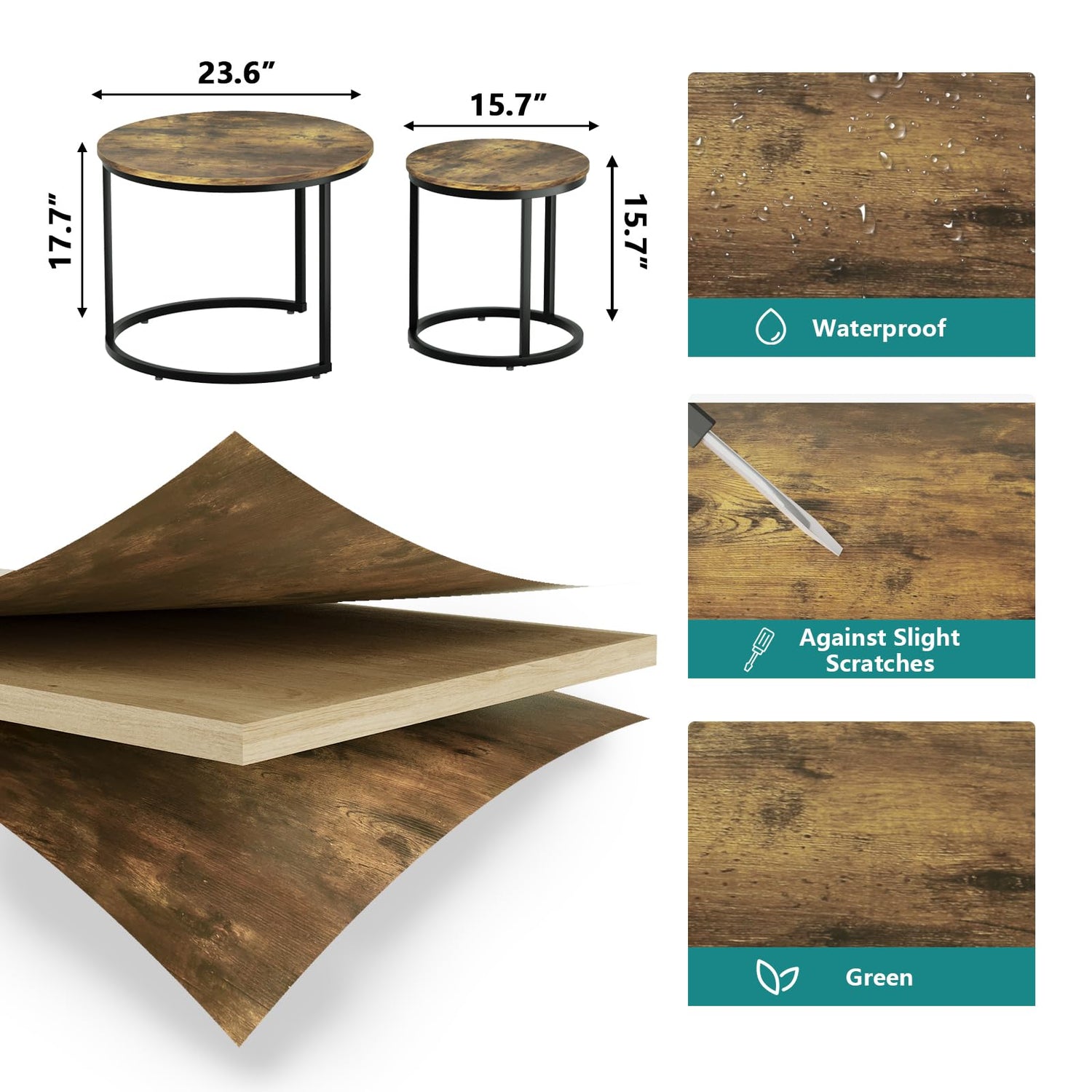 - 【Beautiful and practical】This round nesting table for the living room features a vintage design style with elegant curves and simple lines. The matte black metal base and rustic wooden pattern table top blend seamlessly with modern and industrial design while maintaining a rustic and minimalist aesthetic.