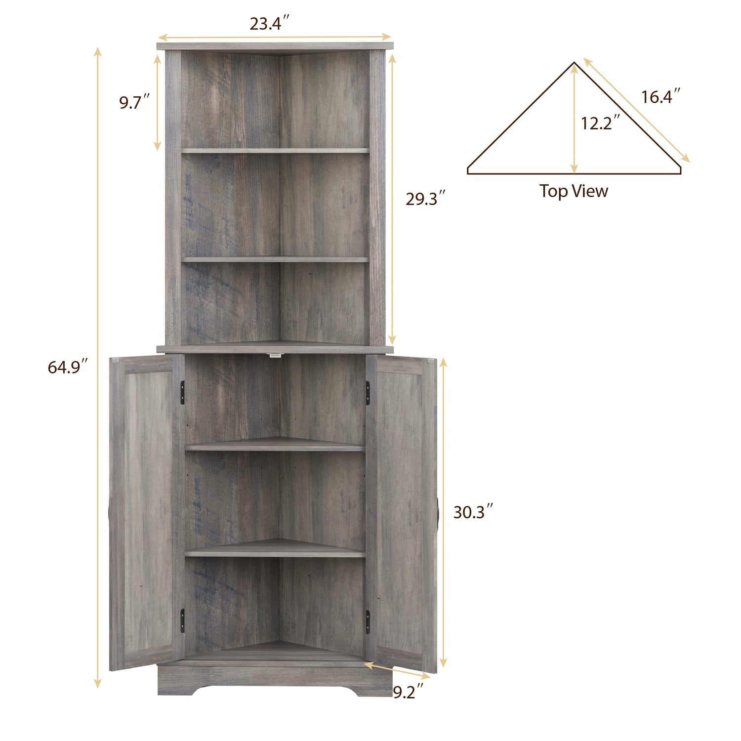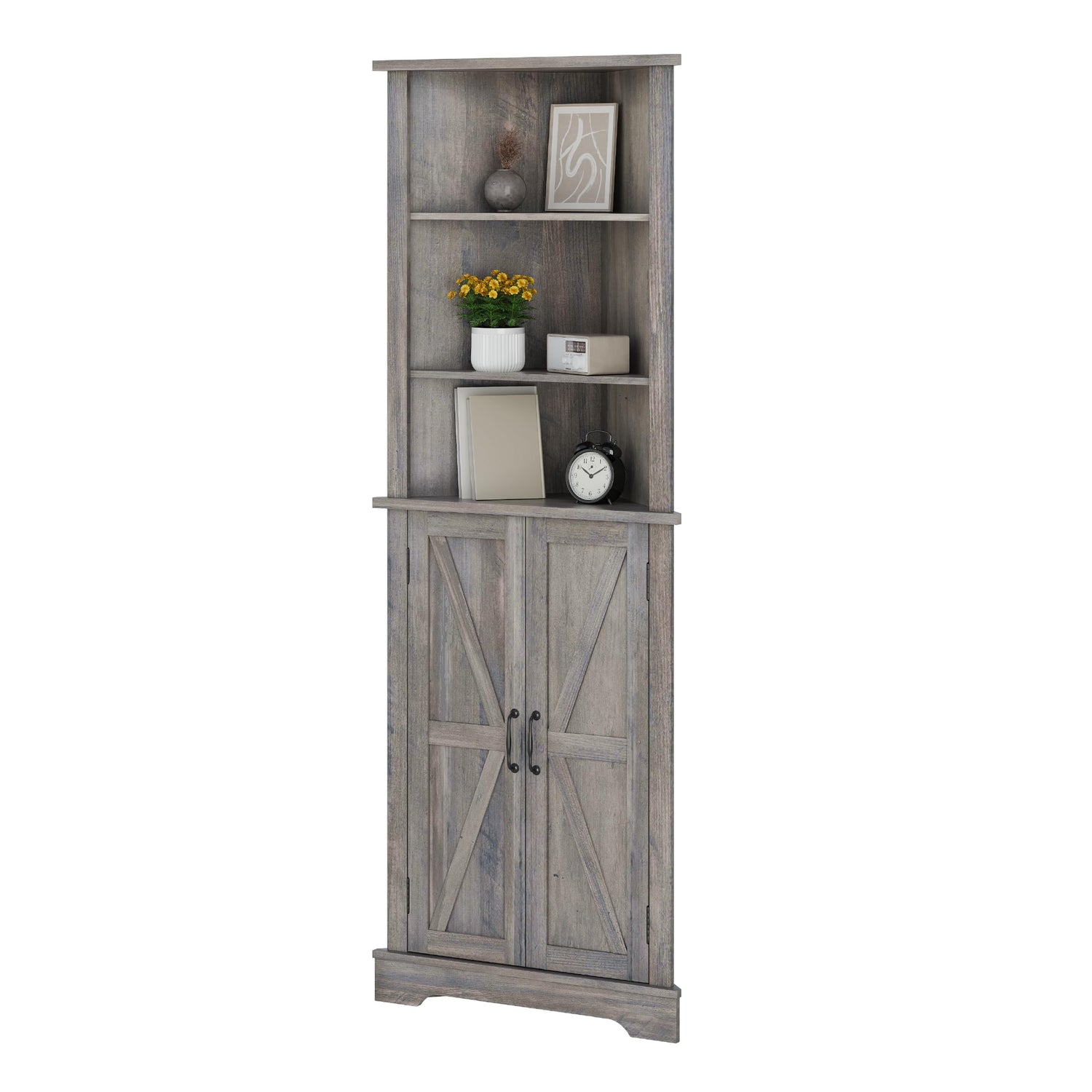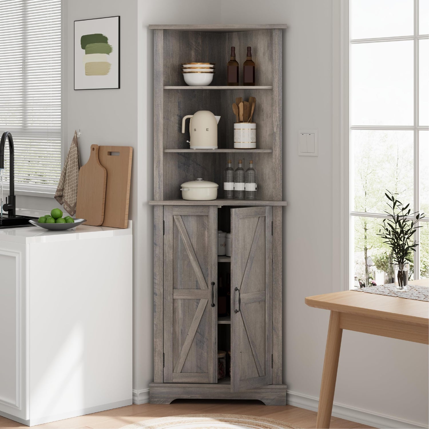 Smuxee Tall Corner Storage Cabinet, Farmhouse Corner Cabinet with Barn Door and Adjustable Shelf, Wash Grey Freestanding Cabinet Organizer for Bathroom, Kitchen, Living Room
