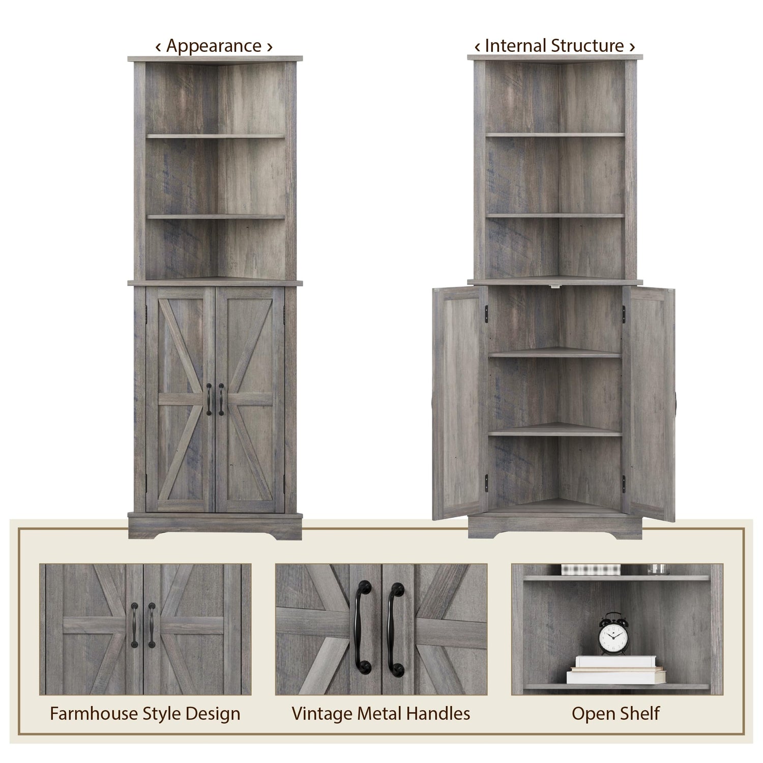 - Farmhouse Style: The Tall corner cabinet is designed with barn doors with rustic metal parts, full of rustic flavor, adding decorative charm to your home.