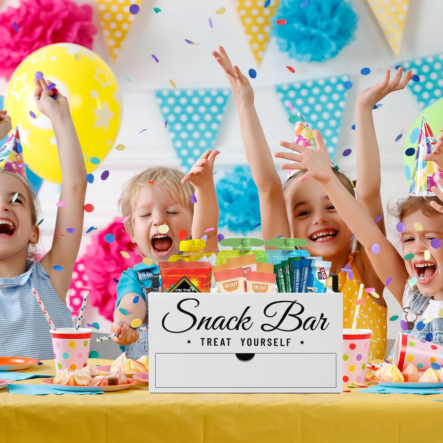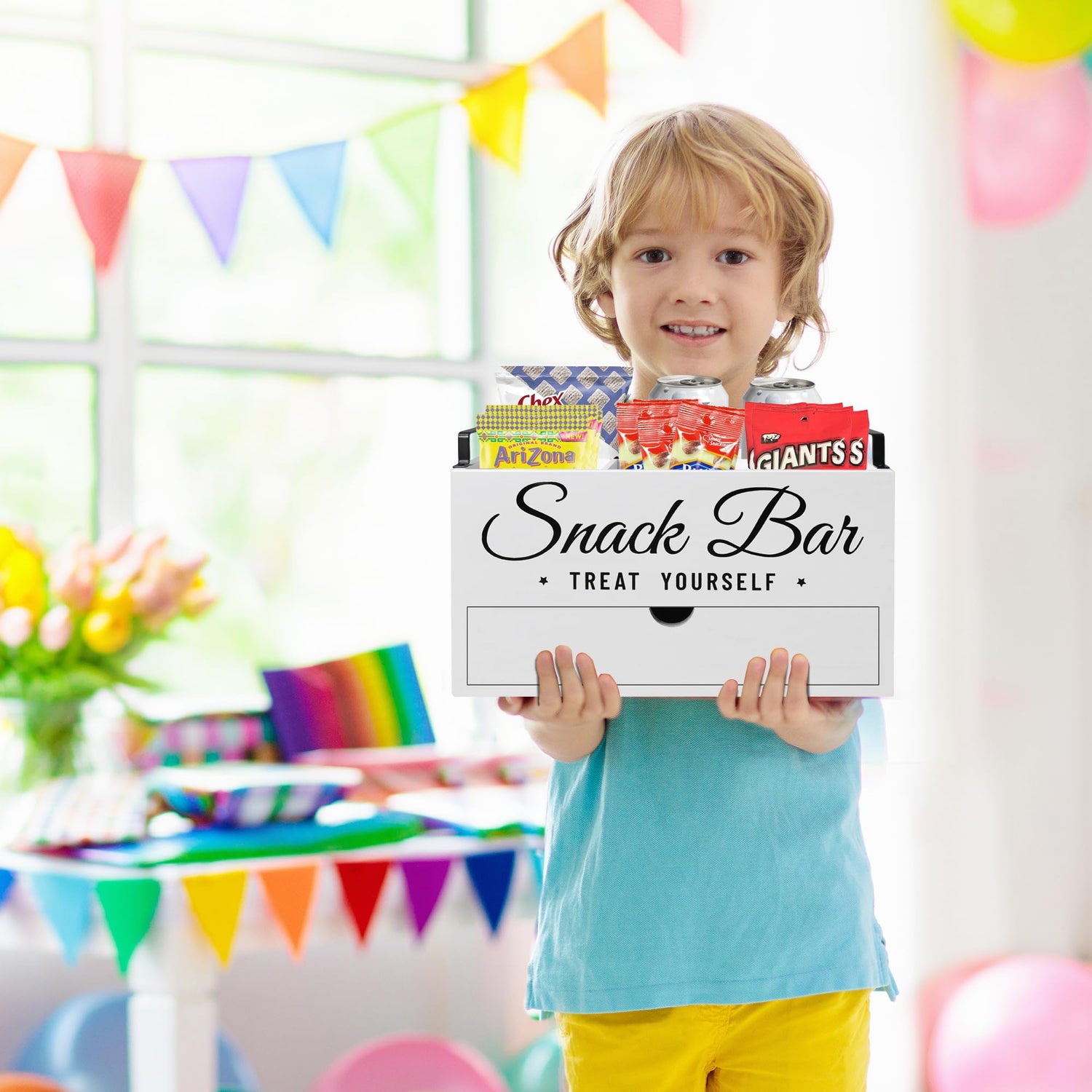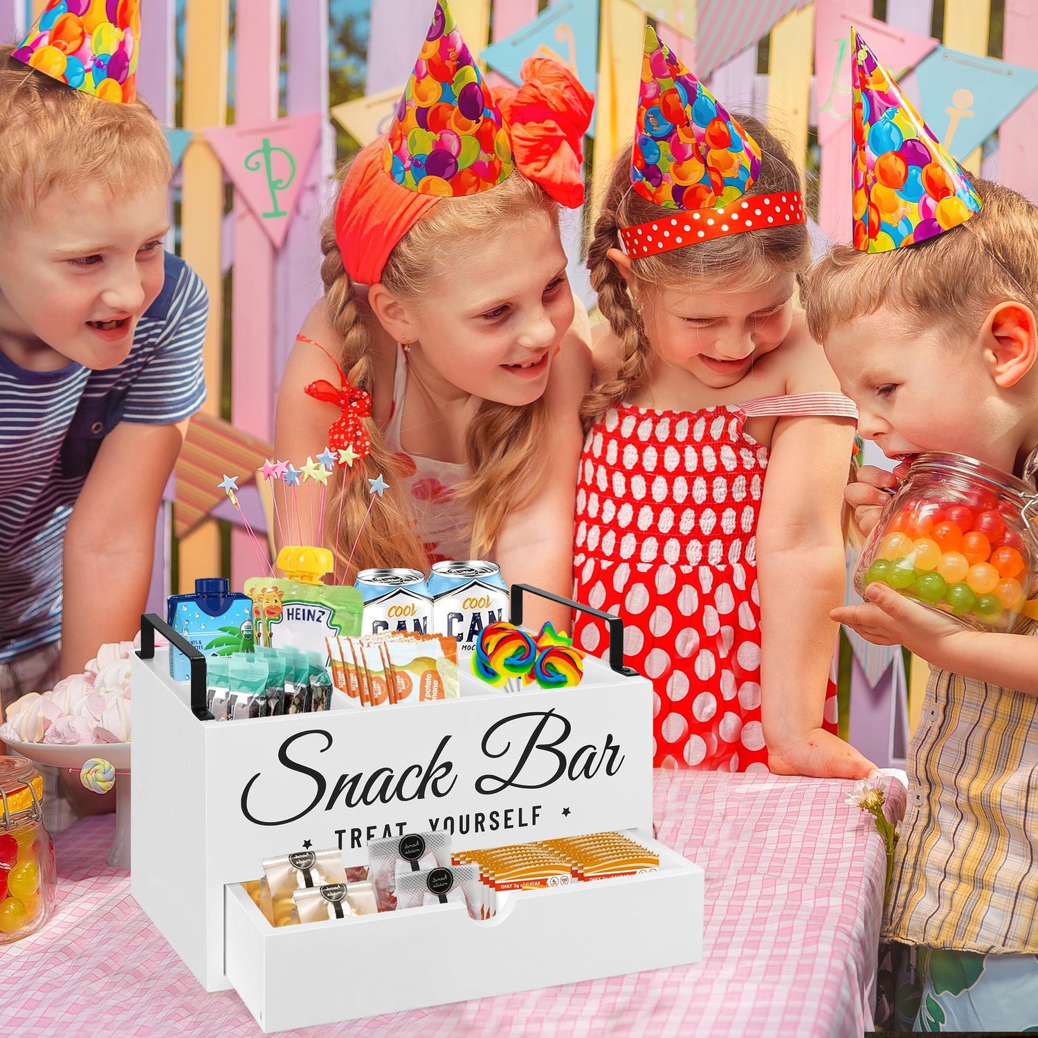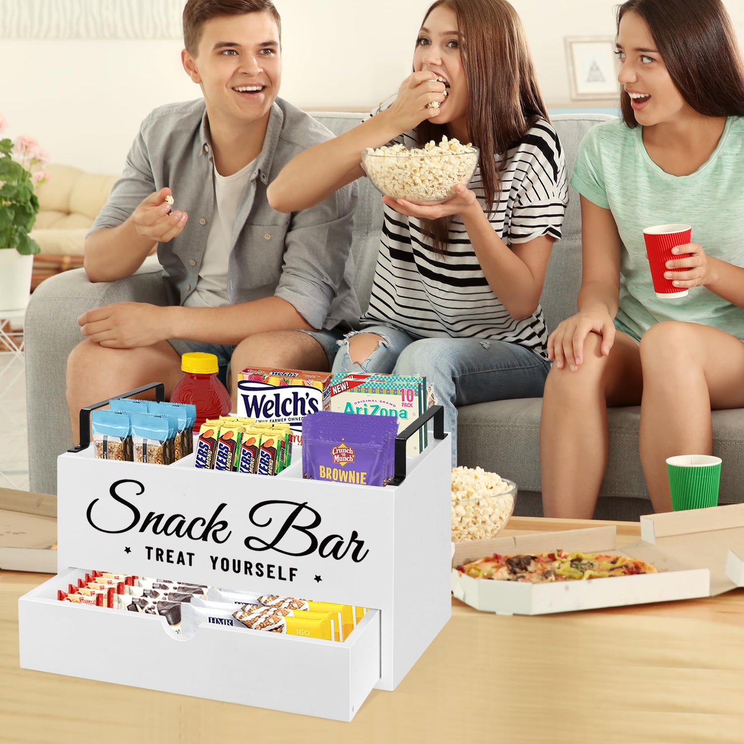 - 【High-Quality & Farmhouse Snack Bar Decor】Our snack organizer bin is made of solid wood material and painted black surface, it features lightweight, durable and easy to clean, which can accompany you for many years. The snack bin has pre-drilled holes for easy installation of the handles. With simple lines, square metal handles, and white fonts displaying "snack bar" and "treat yourself" on the front, every detail of snack containers blends and complements each other perfectly