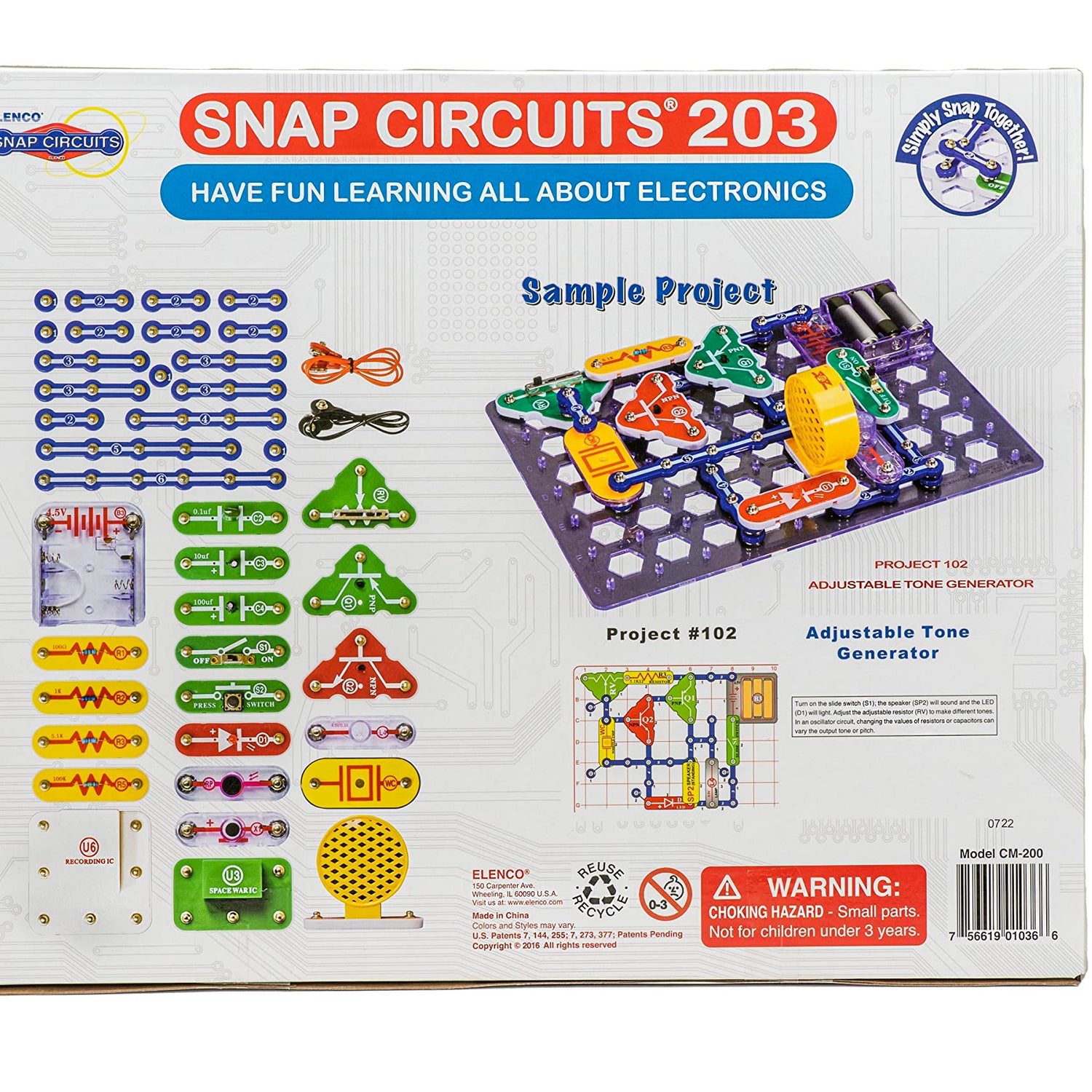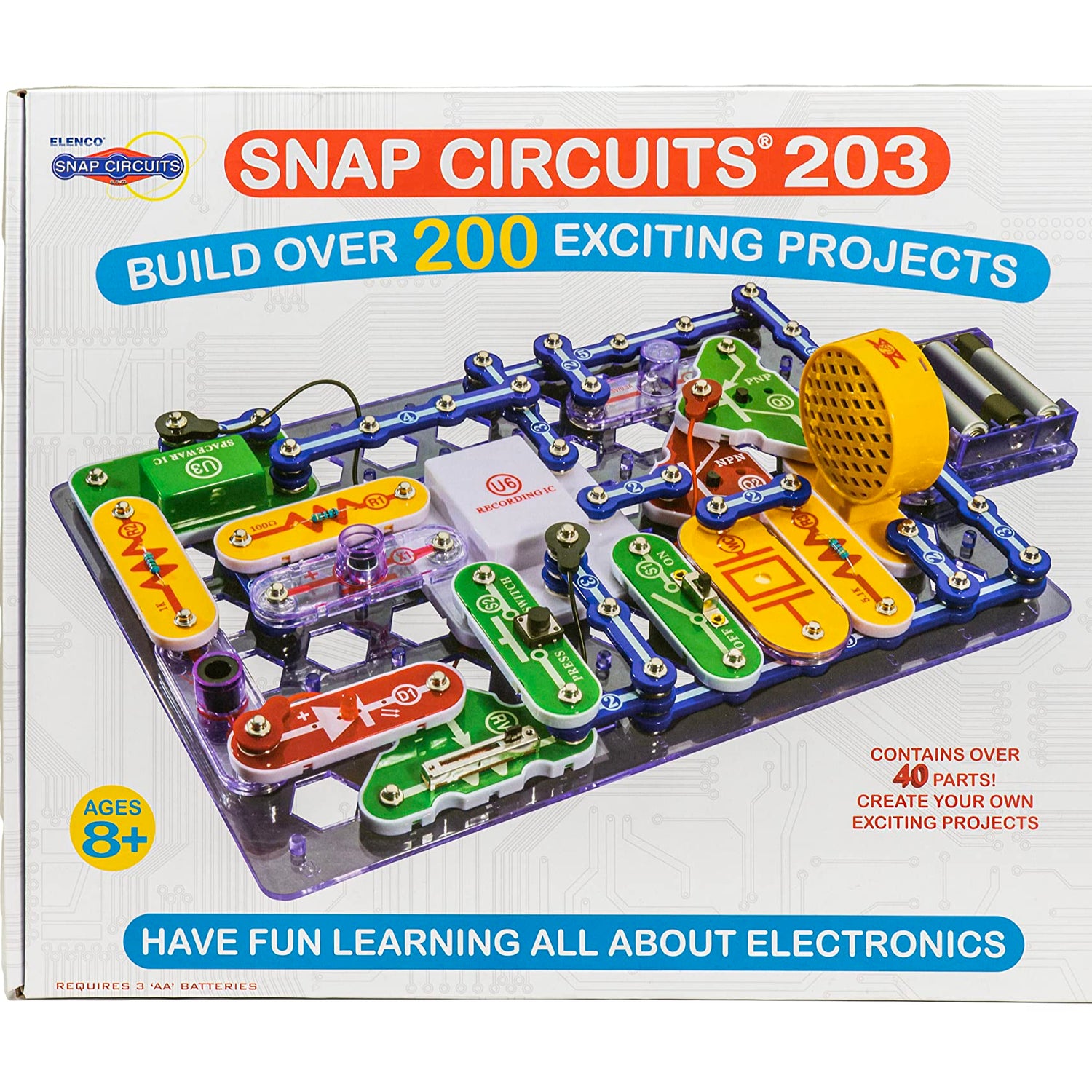 Details: Snap circuits 203 covers 203 projects with exciting electronics concepts. Circuit Maker kits make learning electronics fun and easy but engaging. No bored kids here. All components are mounted in plastic modules and snap together with ease. Enjoy hours of educational fun while learning about electronics and building analytical and problem solving skills. Project #1, a simple introduction to the basic circuit "Electric Light & Switch". in #14 let's find out what conducts electricity with "Conduction Detector". projects #20 and #21 compare "Parallel Resistors" and "Series Resistors" project # 78, "Two-Finger Touch Lamp" puts you in the middle as you use your body complete the circuit. Project #131 builds a circuit you can install in your basement for water leak detection. Instruction manual includes the basic dos and don'ts of electricity and electronics. Contains 42 snap circuits parts and project guide. 3 AA batteries needed but not included. For ages 8 & up. No tools required.