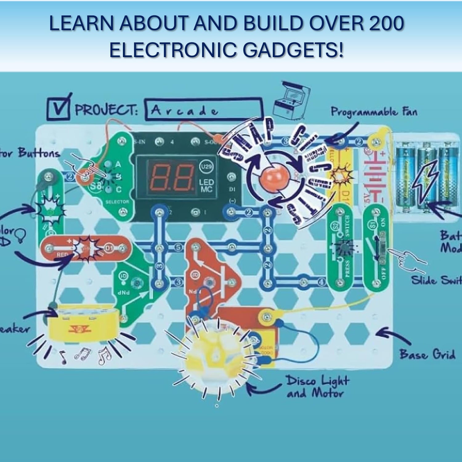 Details: "Snap circuit’s arcade uses building pieces that snap on a simple "rows-and-columns” base grid that functions like the printed circuit board found in most electronic products. Each component is easily identifiable by a different color and functional purpose. This STEM kit includes over 200 projects that utilize 30 components. Includes projects like an internal micro controller that is pre-programmed with lots of fun to play interactive games, a programmable word fan, a tri-color light orb, and a dual-LED display. The snap circuit’s arcade building sets offer concrete, STEM/ steam concepts with fun learning activities and creativity. Learn the basics of electricity, engineering, and circuitry with full color, curriculum-rich, easy-to-follow instructions.requires 3 AA batteries (not included).snap circuit products were created to provide a fundamental, hands-on education in how electrical circuits work to run everyday devices. All parts mount on plastic modules that snap together with ease. Young engineers will have hours of educational fun learning about electronics and how to build circuits. The circuit safe patented safety device (unique to Snap Circuits branded products) makes learning circuitry safe.snap circuits products have won many awards, including toy of the year (toty), Austria's best toys for kids, parent's Choice Recommended, good housekeeping's best toy, family choice, National Parenting publications awards (Nappa gold), children's choice, Dr. Toy (100 best children's products, 10 best educational products, Green toy company), the inaugural seriously STEM award & Kapi award.snap circuits is endorsed by Educators worldwide and used in schools, libraries, museums, and stem programs."