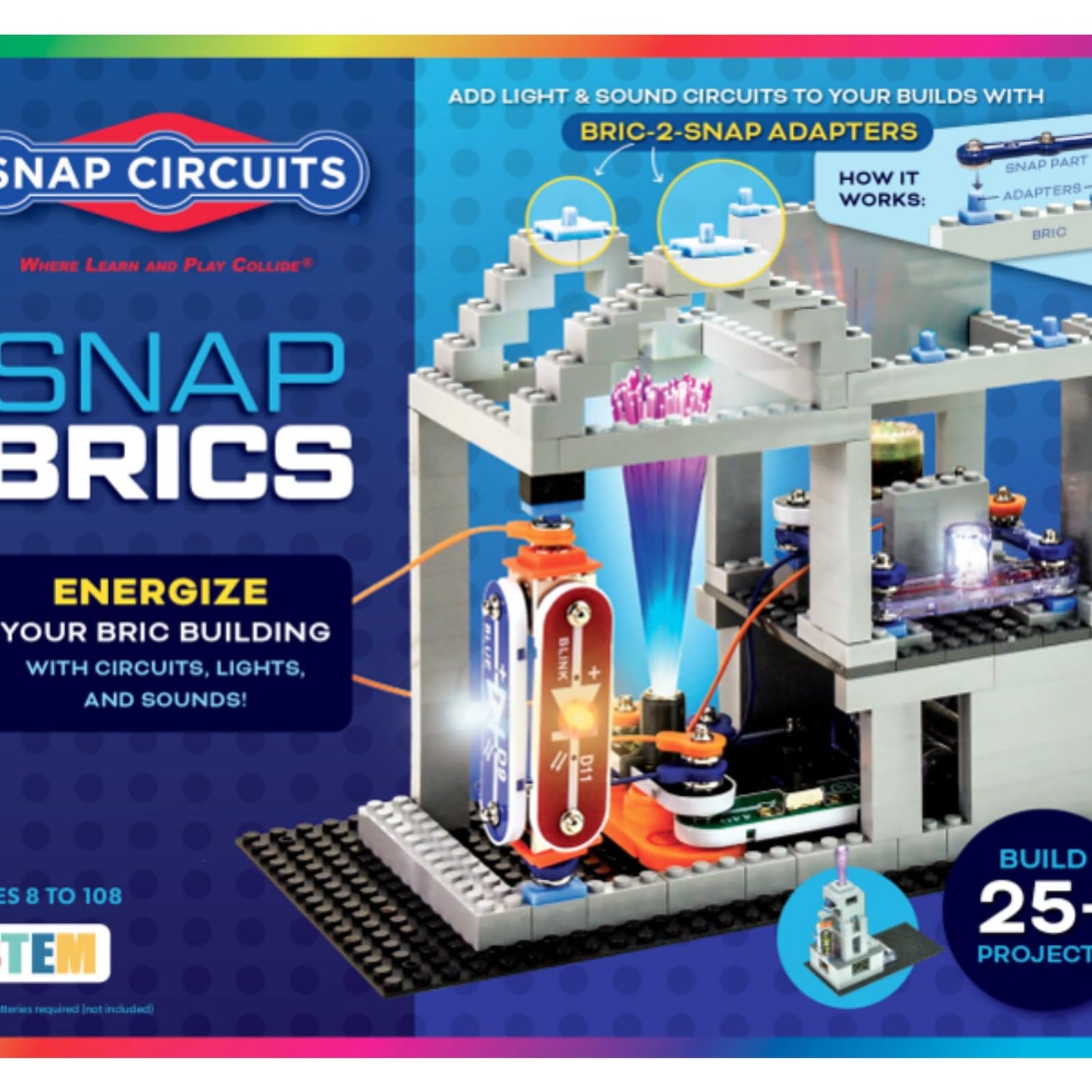 Details: Bric: structures combines the best of Snap Circuits with ordinary building bricks to create endless combinations of construction and circuitry! With patent-pending, bric-2-snap technology, kids can wire up their brick builds with Snap Circuits lights, sounds, moving parts, and 3-D circuits to invent almost anything and make it go! Kids can energize their brick building experience with Snap Circuits and build innovative structures! Instead of just building a structure, now children can learn how to build the circuit that makes the lights on a skyscraper illuminate or that makes the gears on a drawbridge move! Elenco’s team of engineers has come up with a great way for kids to learn-by-doing and be creative with their everyday building bricks. There's no limit to what kids can create with Snap Circuits bric: structures! Our award-winning Snap Circuits products teach kids to have fun learning electricity, engineering, circuitry and more. Snap Circuits features building components with snaps to assemble electronic circuits that function like the printed circuit board found in most electronic products. Snap Circuits bric: structures includes: 20 Snap Circuits component parts, 75 bric-2-snap adapters, over 140 fully Compatible building bricks, and a full-color, easy-to-read project manual. This kit is designed for future engineers 8+.