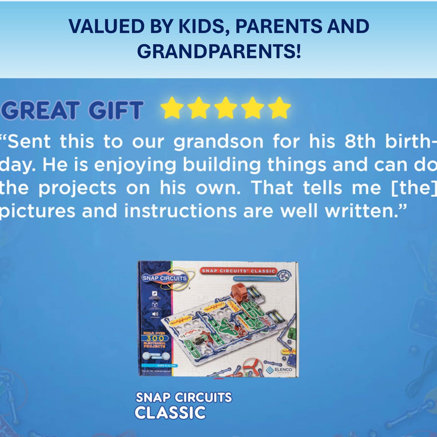 - GREAT GIFT Give the gift of learning and fun this holiday season! Snap Circuits kits will keep kids busy and having fun all year round. Combine with other Snap Circuits kits for even more projects!