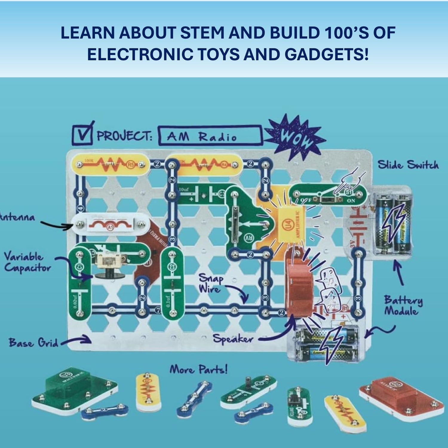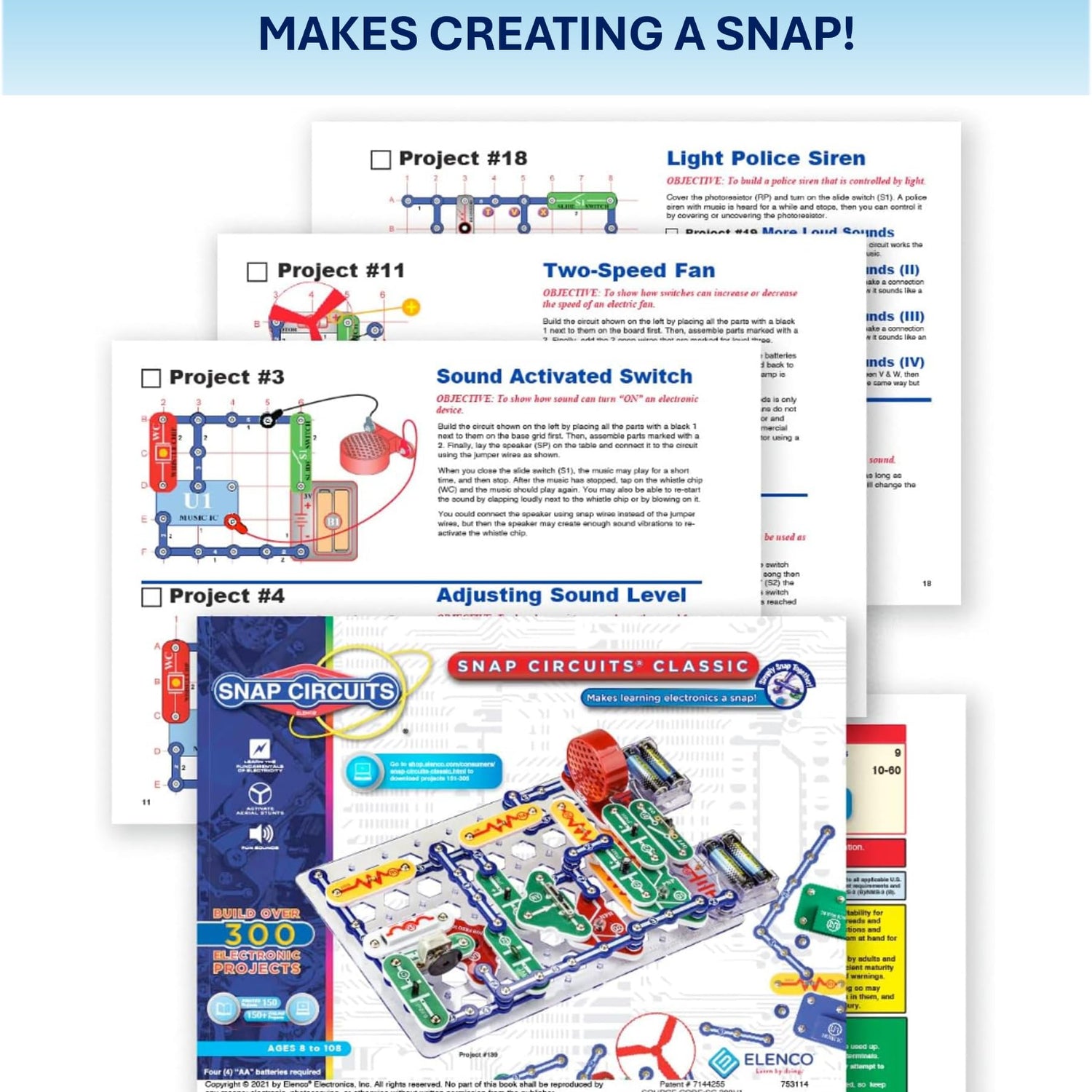 - SO MANY TOYS IN A SNAP: Make dozens of cool electronic gadgets - all from one box! A safe and fun way to introduce children ages 8+ to the basics of electrical engineering! Build exciting projects and toys using the included colorful instruction book!
