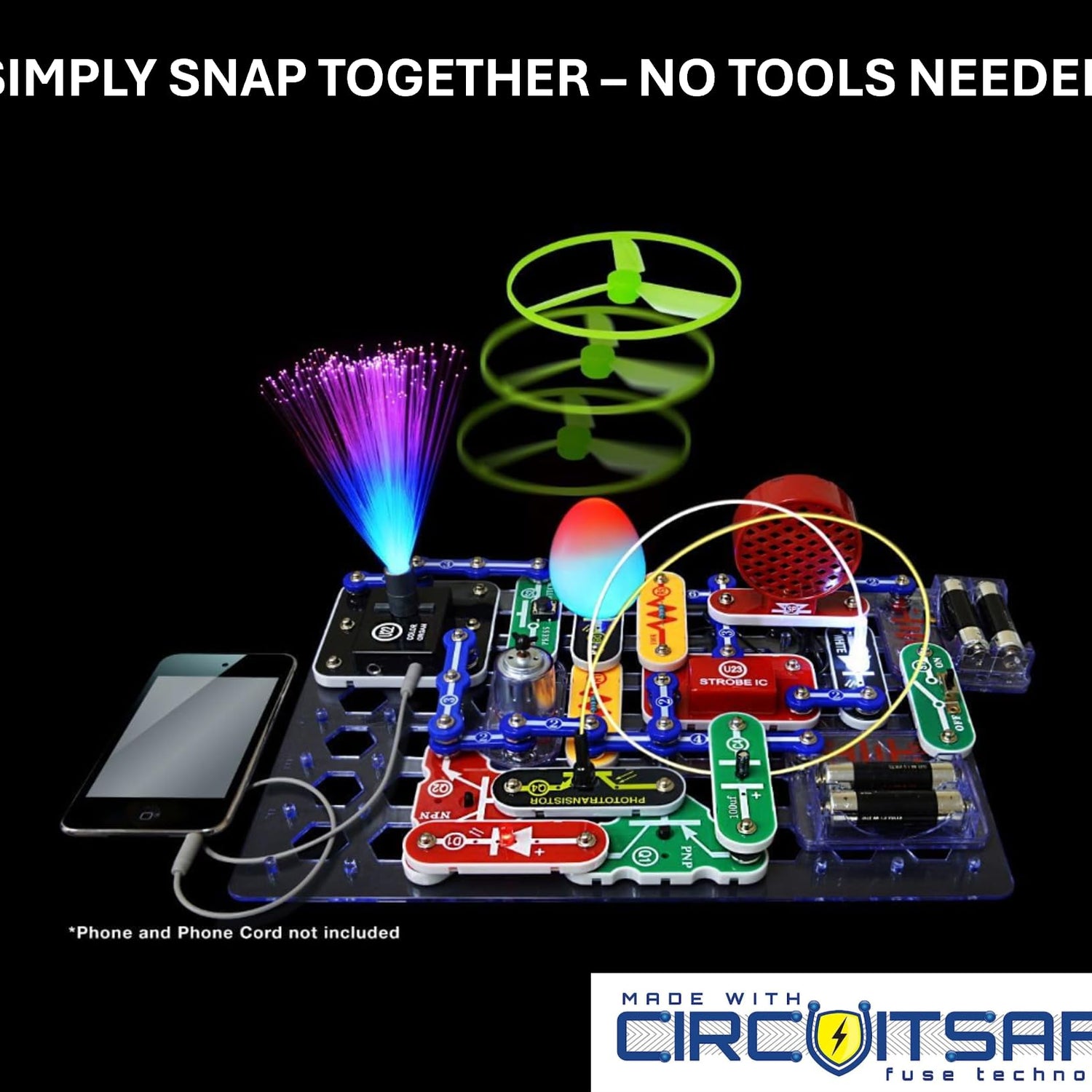 Watch and be amazed at what your music can do with the new Snap Circuits LIGHT. Connect your iPhone or other device and enjoy your music as the lights change to the beat. The strobe light with spinning patterns will amaze you with its visual effects. Elenco's Snap Circuits makes learning electronics easy and fun! Just follow the colorful pictures in our manual and build over 175 exciting projects. All parts are mounted on plastic modules and snap together with ease. Enjoy hours of educational fun while learning about electronics. Snap Circuits are endorsed by educators worldwide and used in schools, libraries, museums, STEM programs and creating with Snap Circuits. The Circuit Safe patented safety device unique to Snap Circuits branded products makes learning circuitry safe. No tools required. Uses "AA" batteries, unless otherwise indicated. Snap Circuits products have won many awards, including Toy of the Year (TOTY), ASTRA'S Best Toys for Kids, Parent's Choice Recommended, Good Housekeeping's Best Toy, Family Choice, National Parenting Publications Awards (NAPPA Gold), Children's Choice, Dr. Toy (100 Best Children's Products, 10 best Educational Products, Green Toy Company), The inaugural Seriously STEM award & KAPi Award.