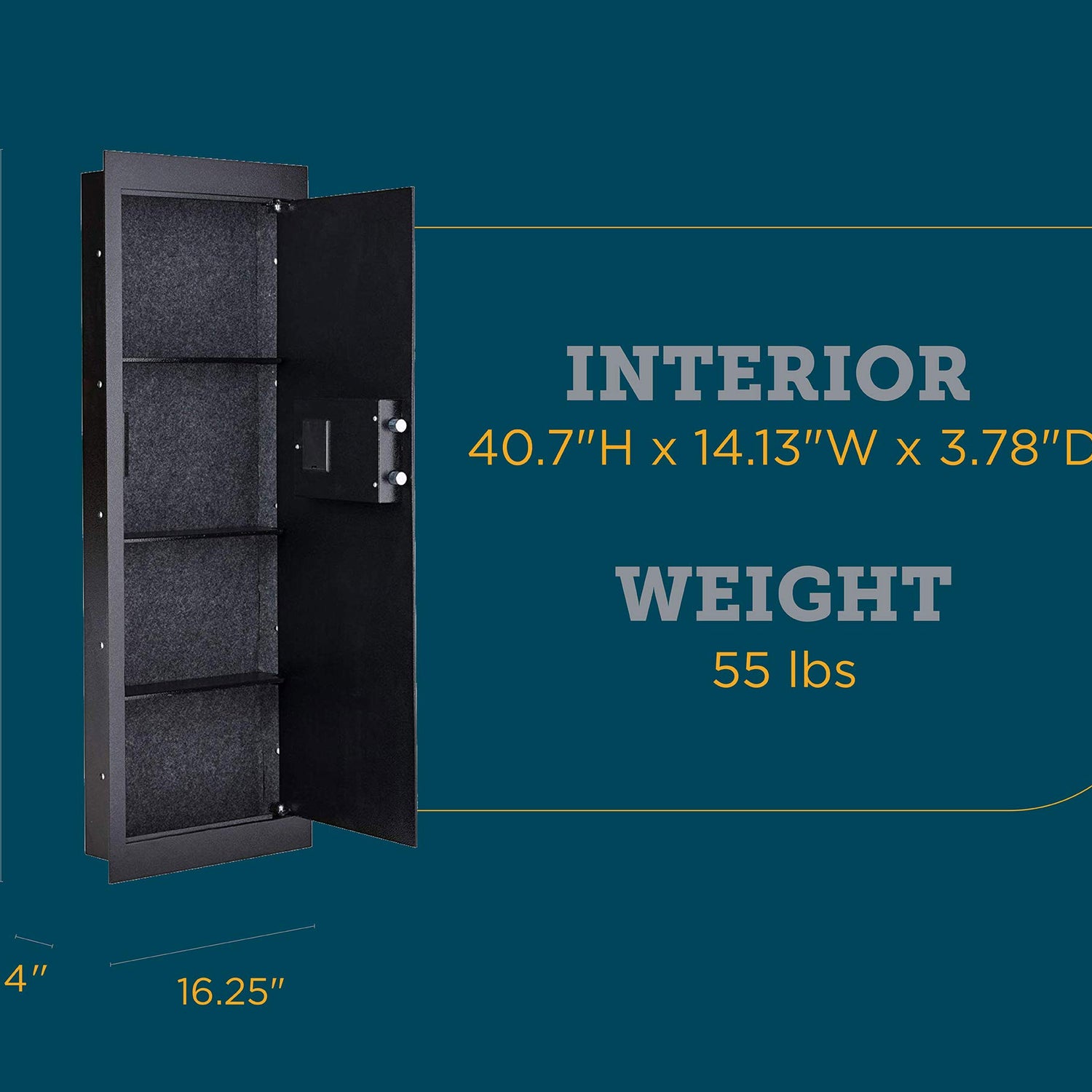 - HIDDEN WALL SAFE SPECS - the gun storage cabinet EXTERIOR measures: 44 inches tall x 16.25 inches wide x 4 inches deep. The INTERIOR measures: 40.7 inches tall x 14.13 inches wide x 3.78 inches deep. WEIGHT of safe in wall is 55 lbs