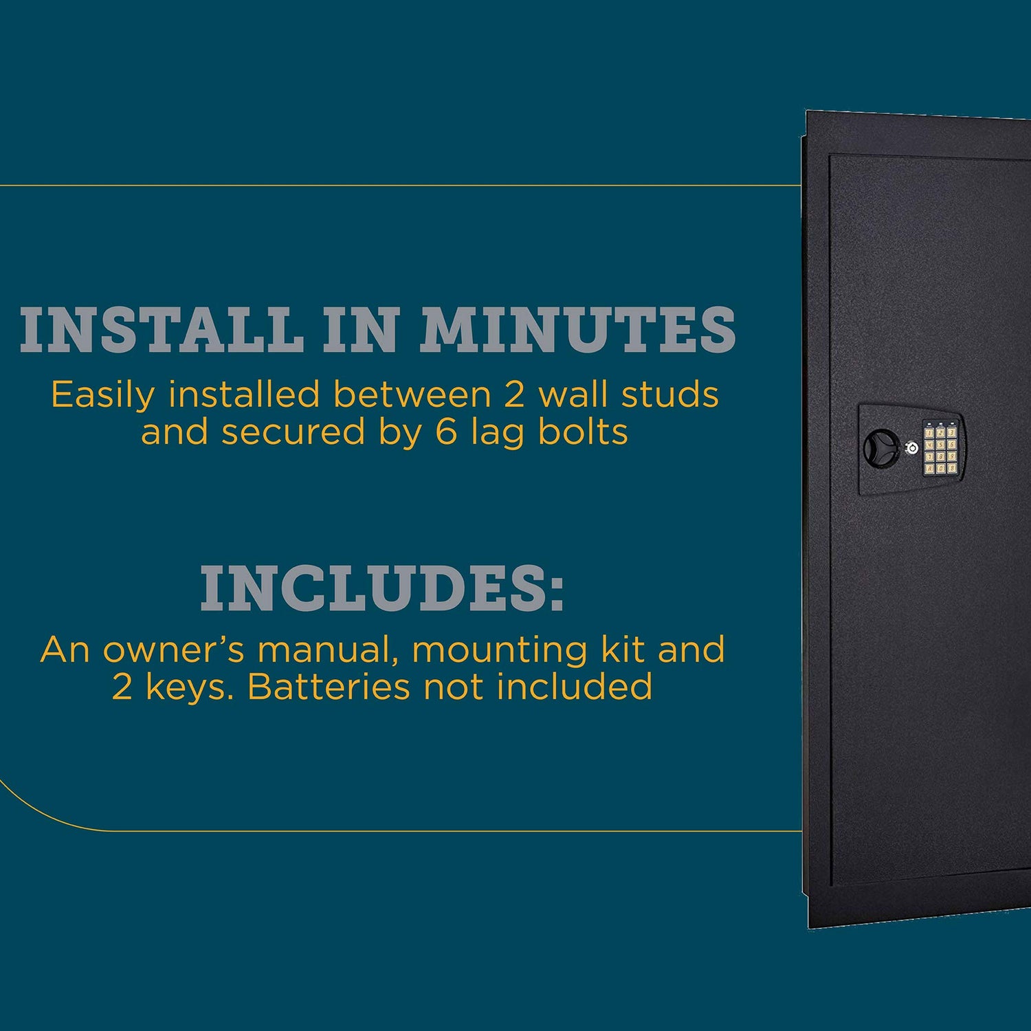 - SECURITY WHERE YOU WANT IT - easy to hide and easy to access, anywhere you want it with the SnapSafe In Wall Safe! Install these secured wall safes between the studs within minutes with 6 lag bolts. INCLUDES: an owner’s manual, mounting kit, and 2 keys. Batteries not included