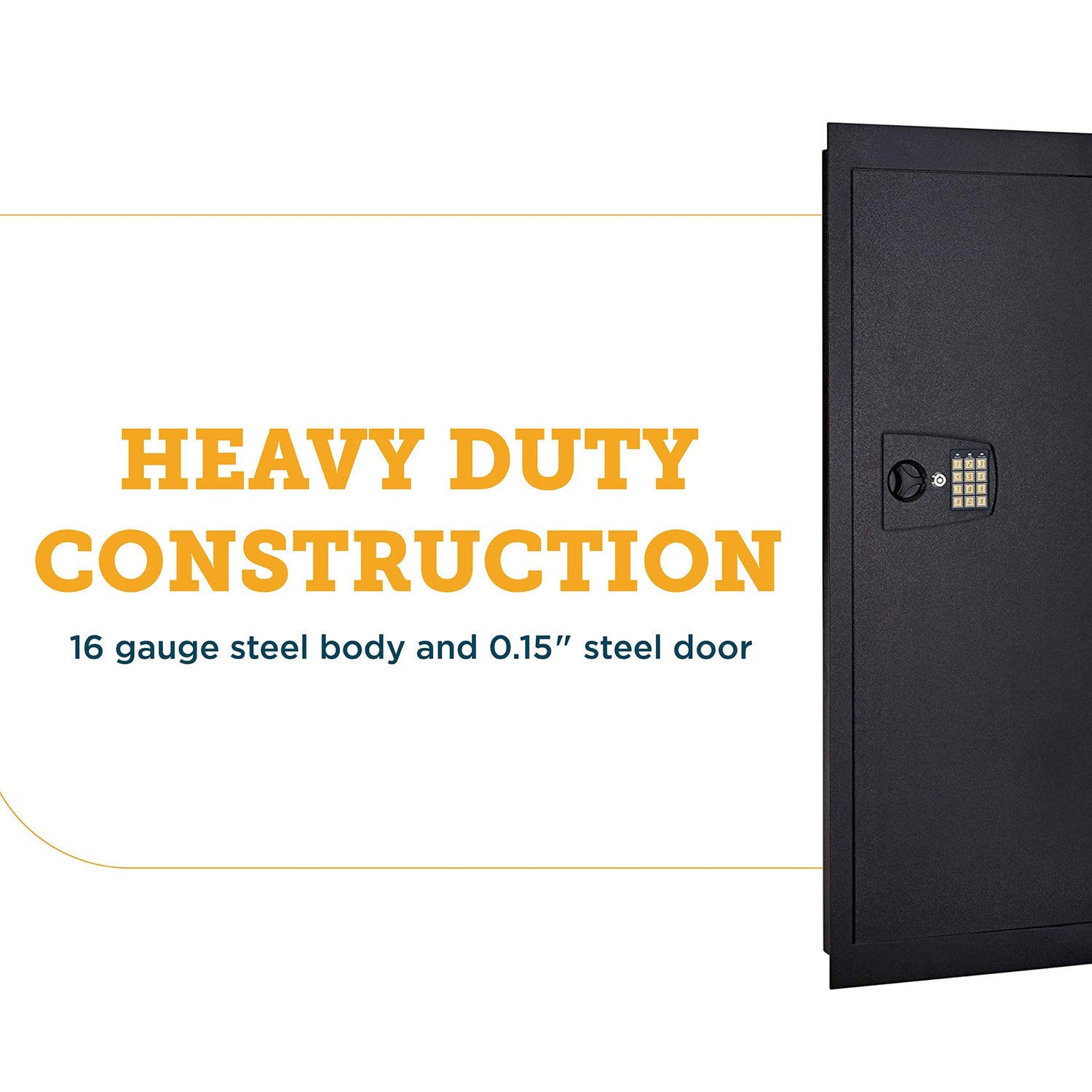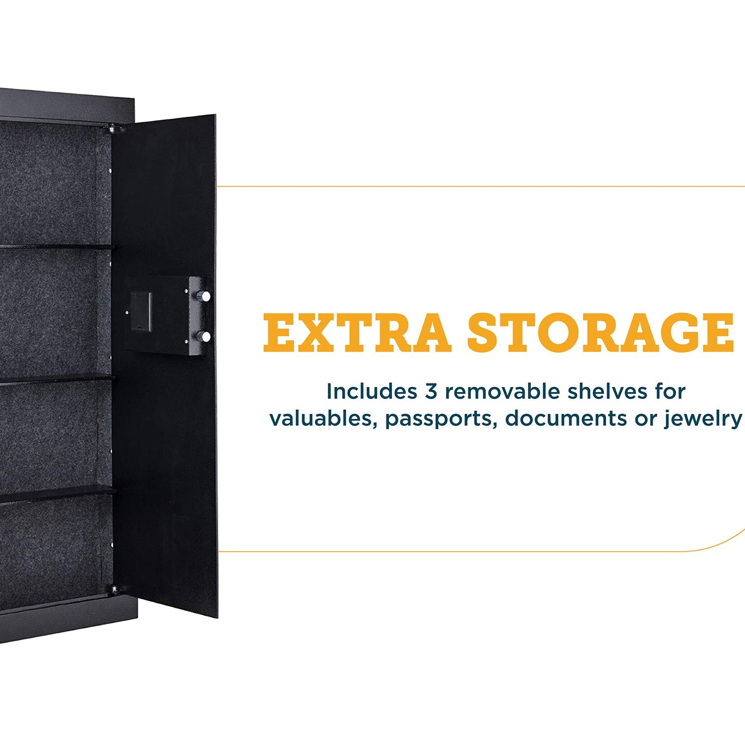 - HEAVY DUTY CONSTRUCTION - sturdy gun cabinet made of 16-gauge steel body and a .15” steel door. Hide this in wall gun safe behind a picture or in a closet to protect your valuables from theft or break-ins. Includes 3 removable shelves for extra storage