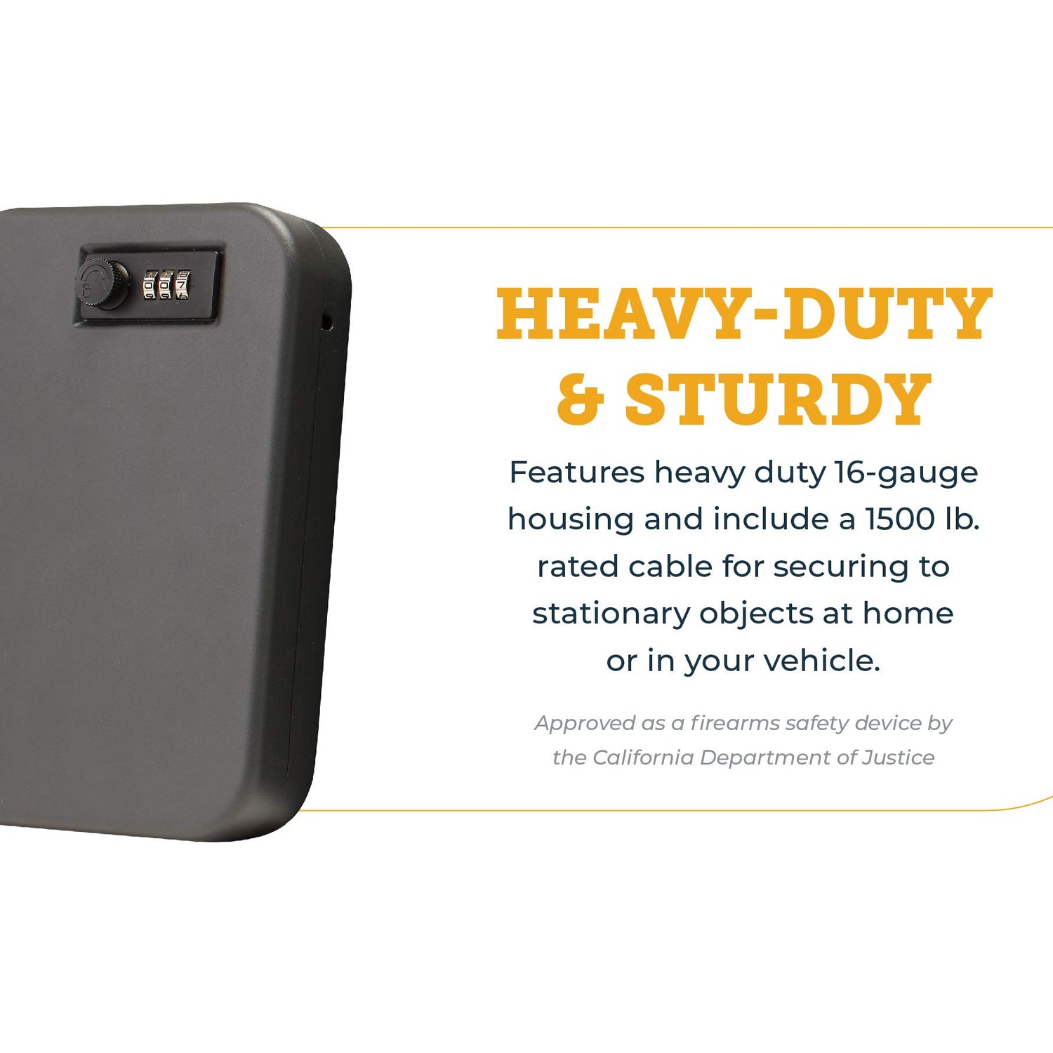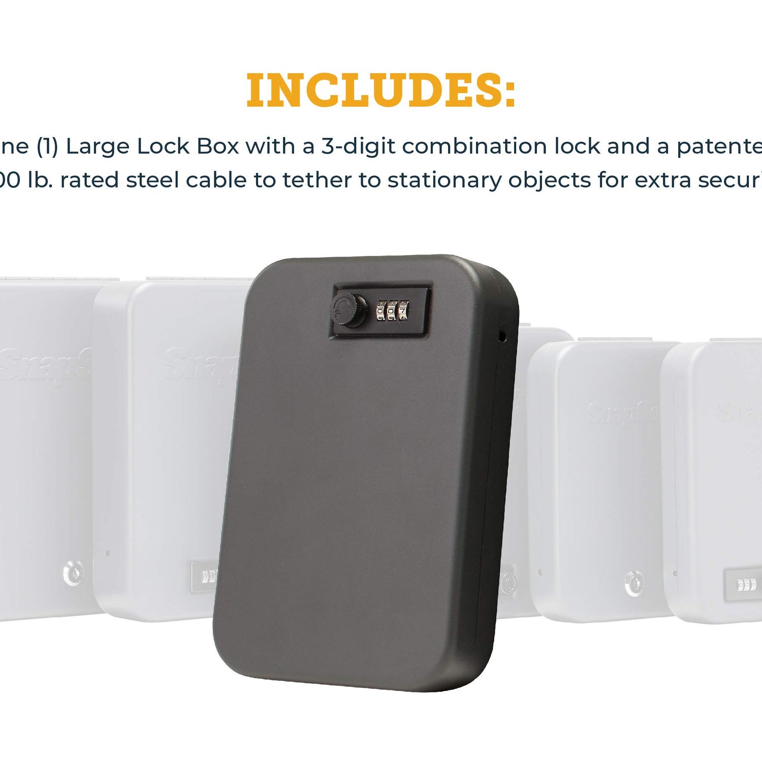 - Heavy Duty and Sturdy – This SnapSafe Lock Box features heavy duty 16-gauge housing and include a 1500 lb. rated cable for securing to stationary objects at home or in your vehicle. Available in 3 sizes - Large, XL and XXL