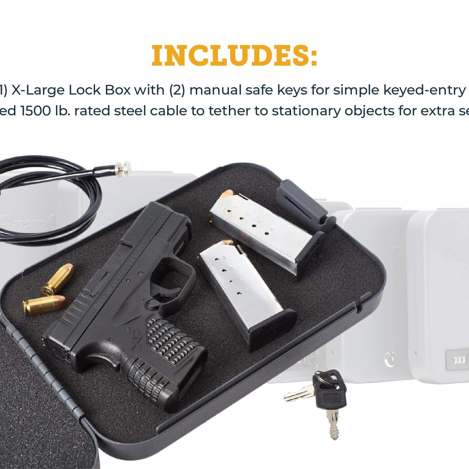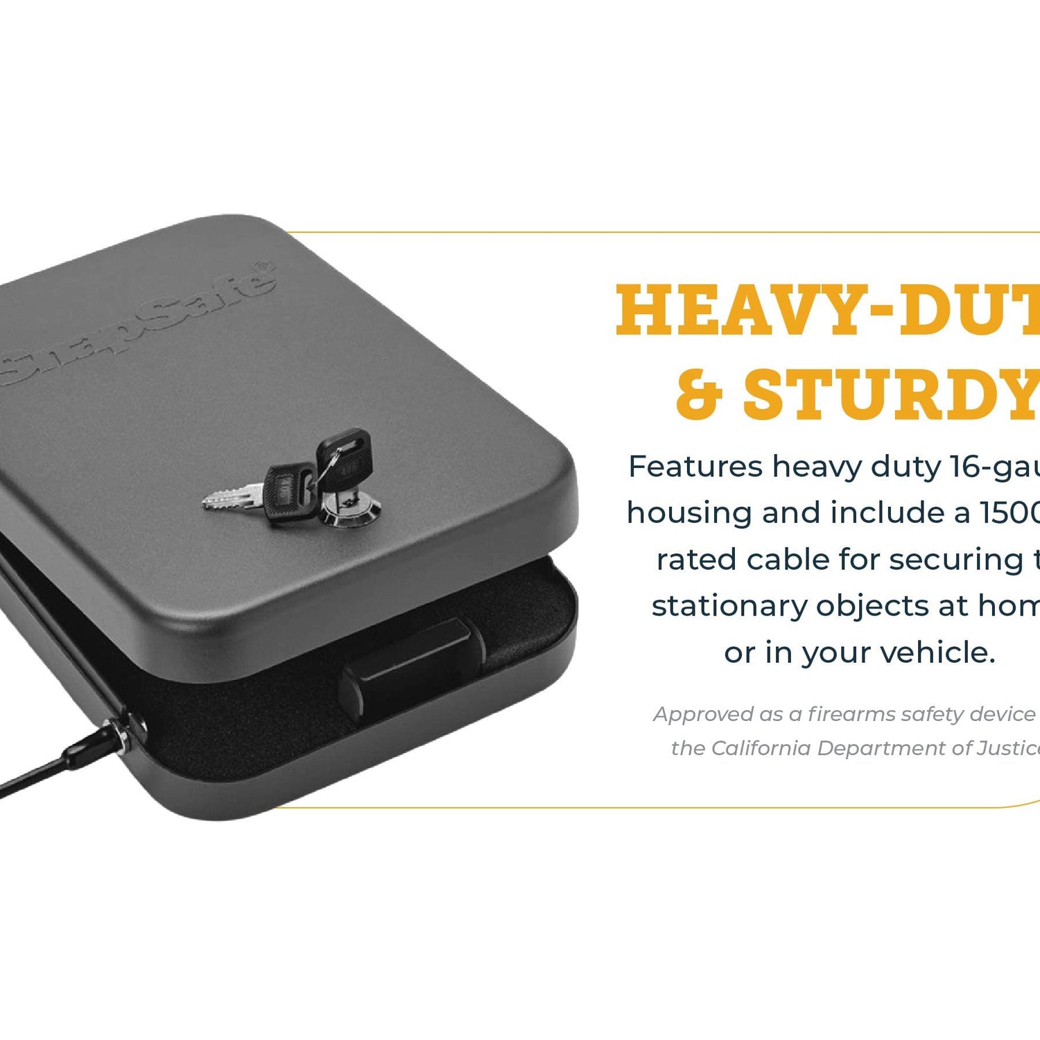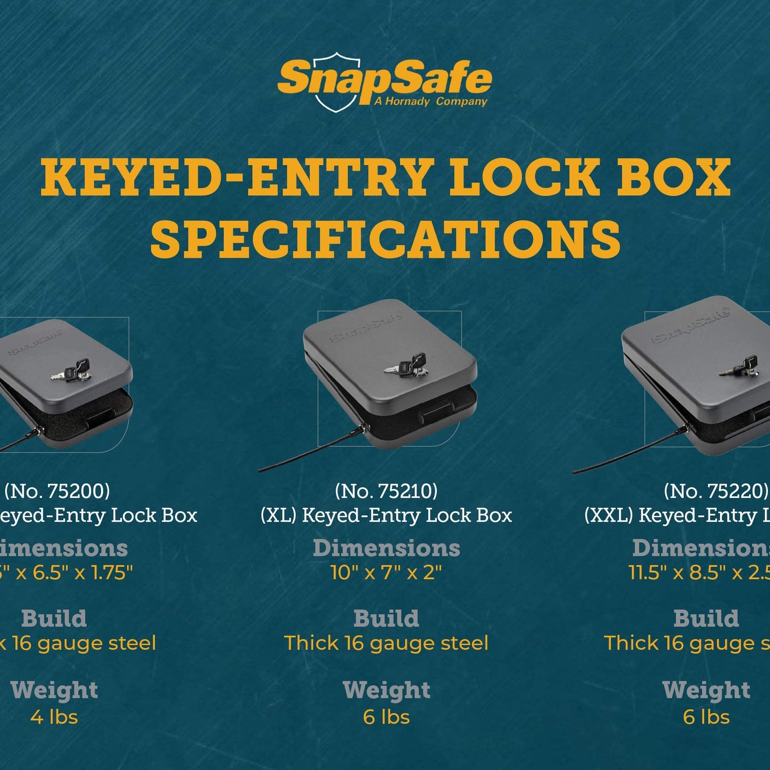 - Heavy Duty and Sturdy Security Safe Box – SnapSafe Lock Boxes feature heavy duty 16 gauge housing and include a 1500 lb. rated cable for securing to stationary objects at home or in your vehicle. Available in 3 sizes - Large, XL and XXL