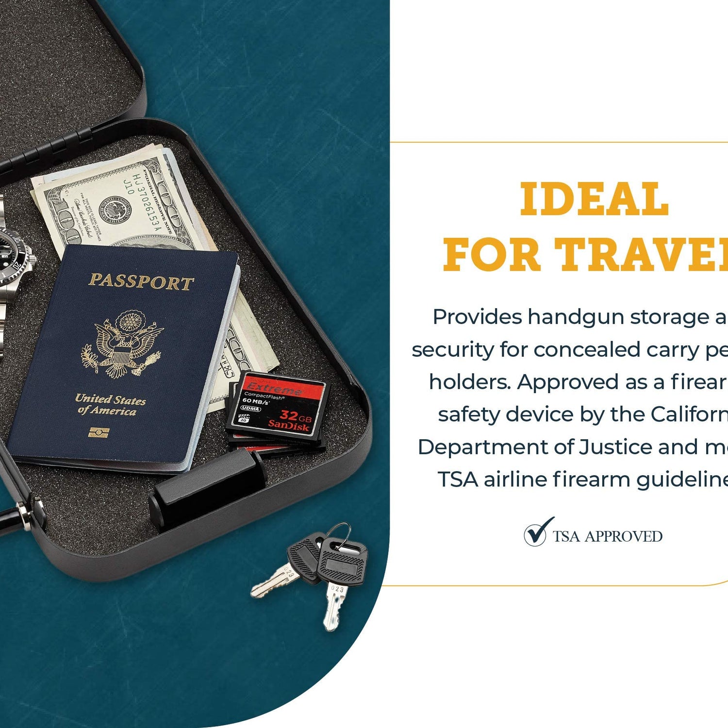 - Ideal for Travel – The metal gun case provides gun storage and security for concealed carry permit holders. Approved as a firearms safety device by the California Department of Justice and meets TSA airline firearm guidelines for a travel safe lock box