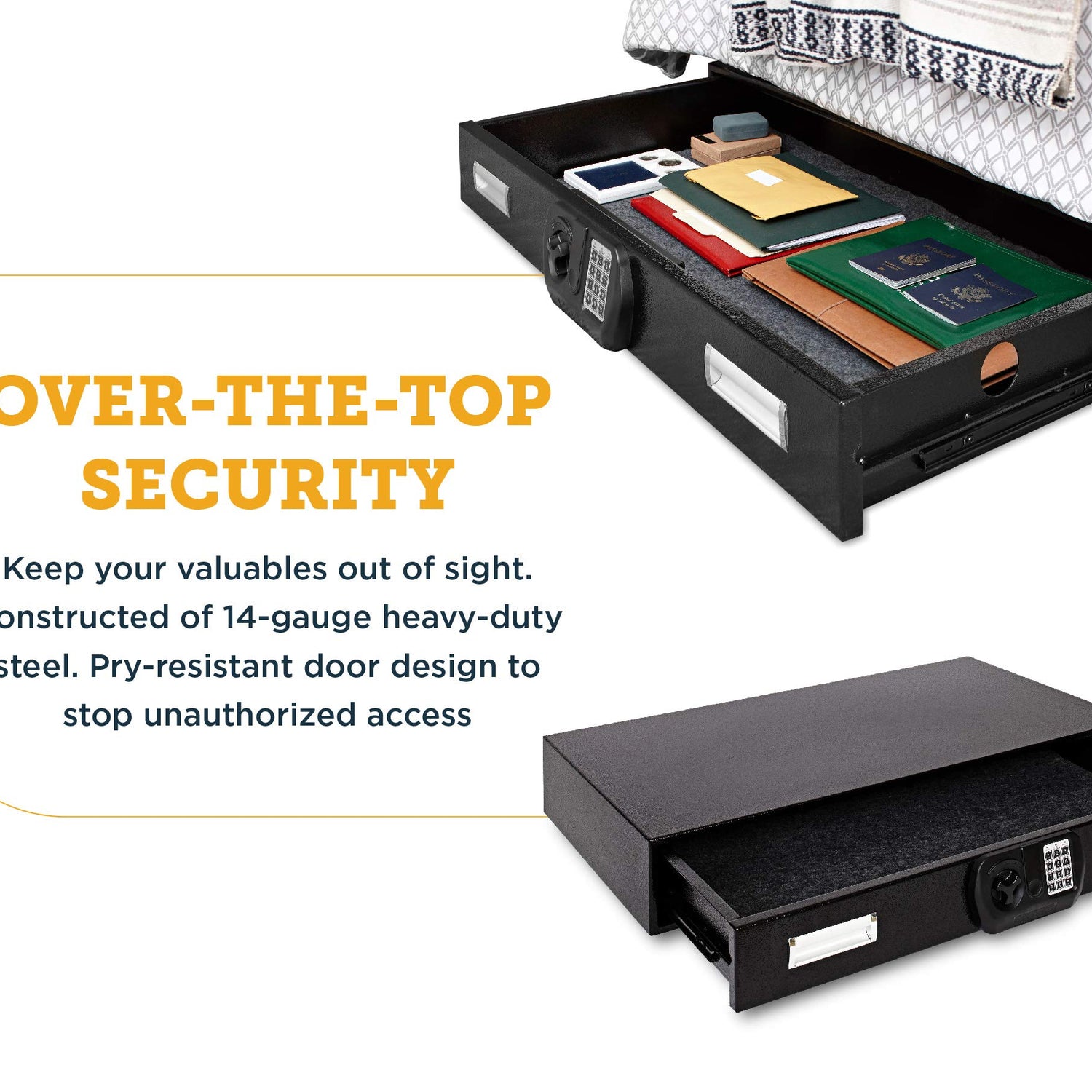 - Sizing and Specifications – Large size underbed safe. Measures 40 (W) x 6 (H) x 22(D) inches. Weighs 105 lbs. Constructed of 14-gauge heavy-duty steel. Pry resistant door design to stop unauthorized access