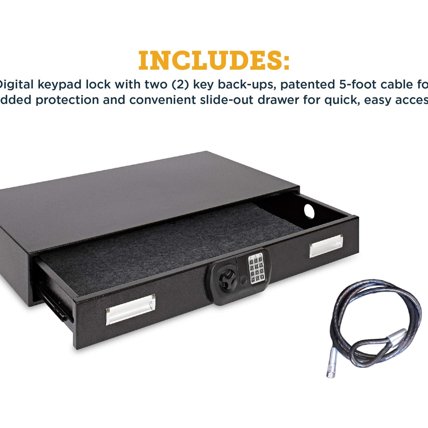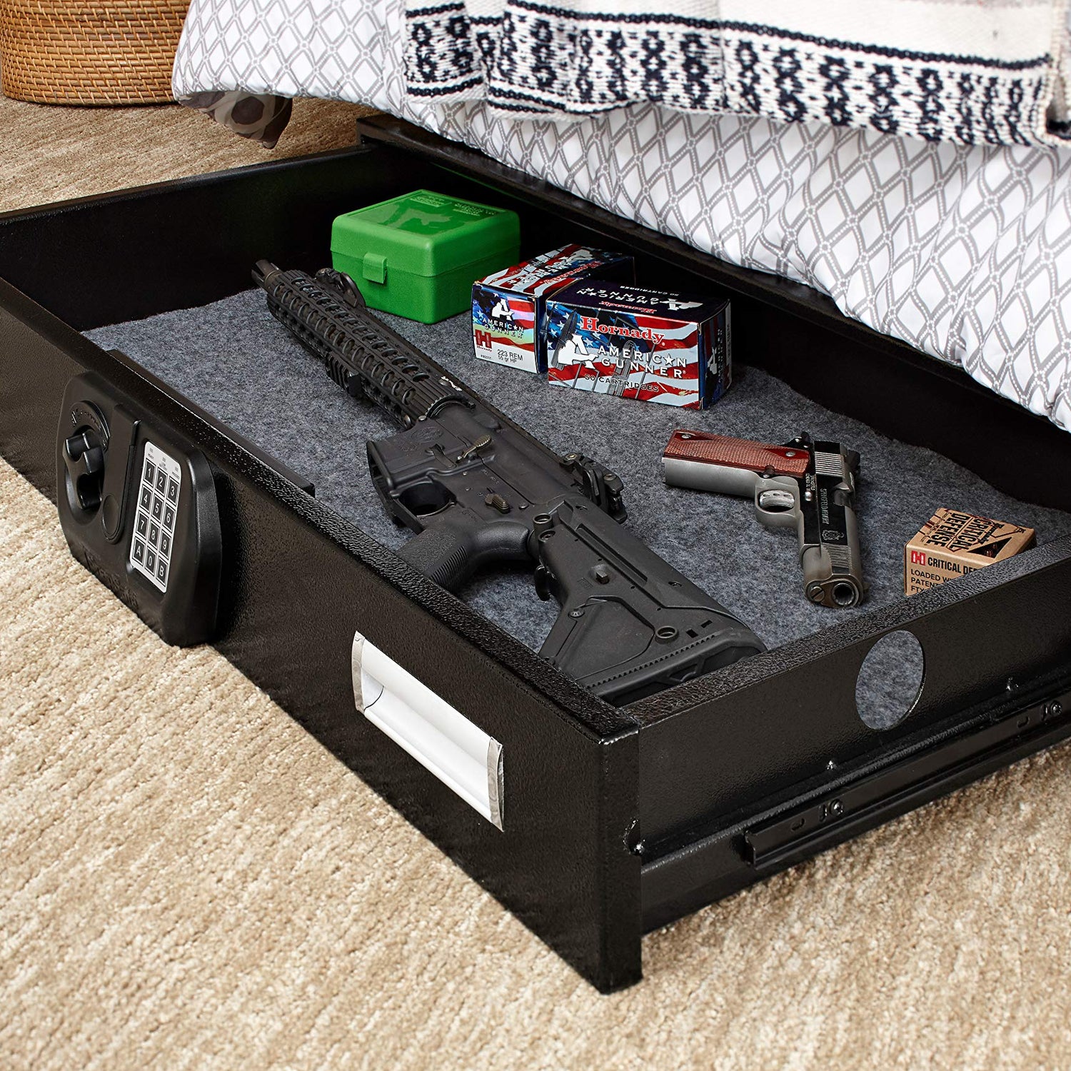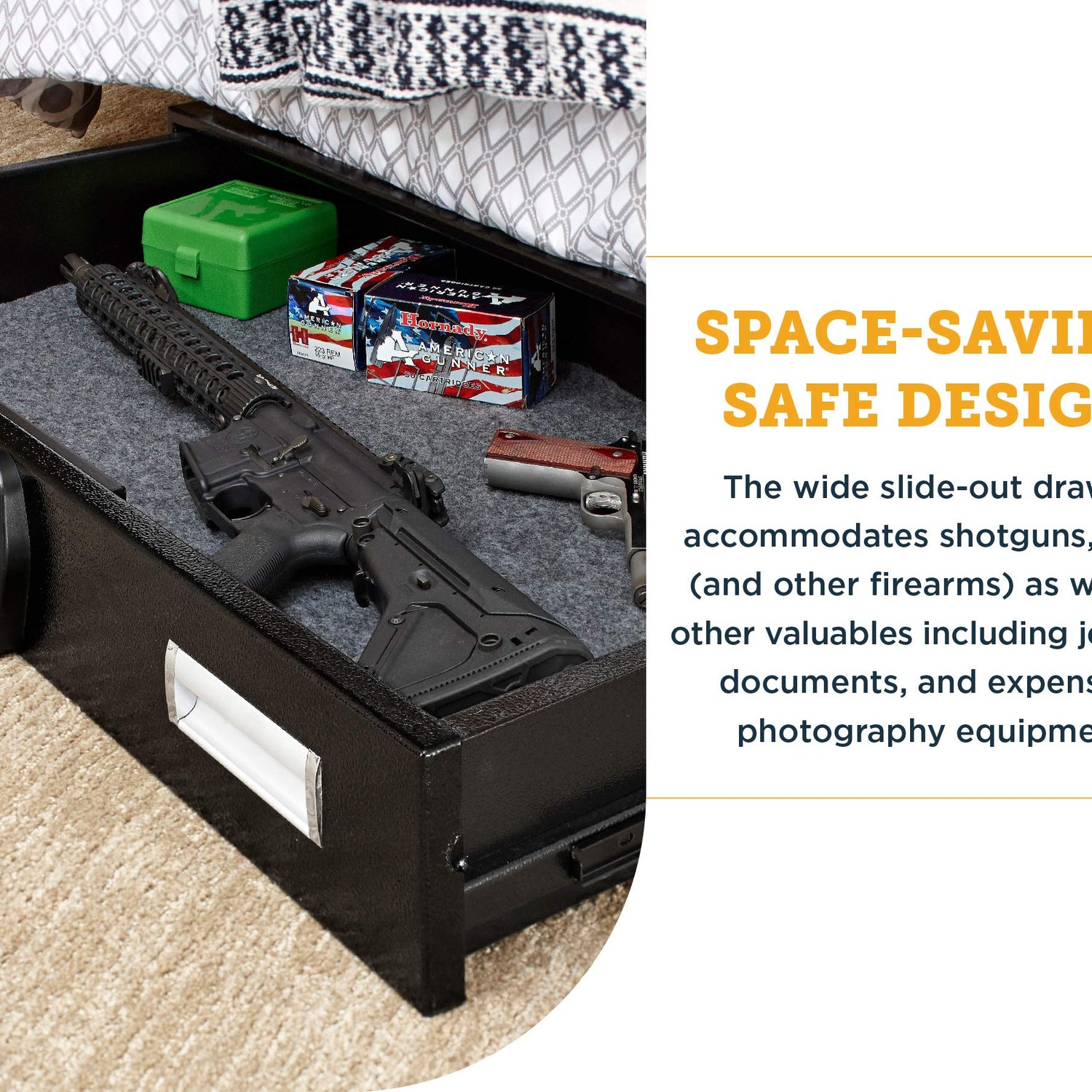 - Space-Saving – The wide slide-out drawer accommodates shotguns, rifles (and other firearms) as well as other valuables including jewelry, laptops, tablets, documents, and expensive photography equipment