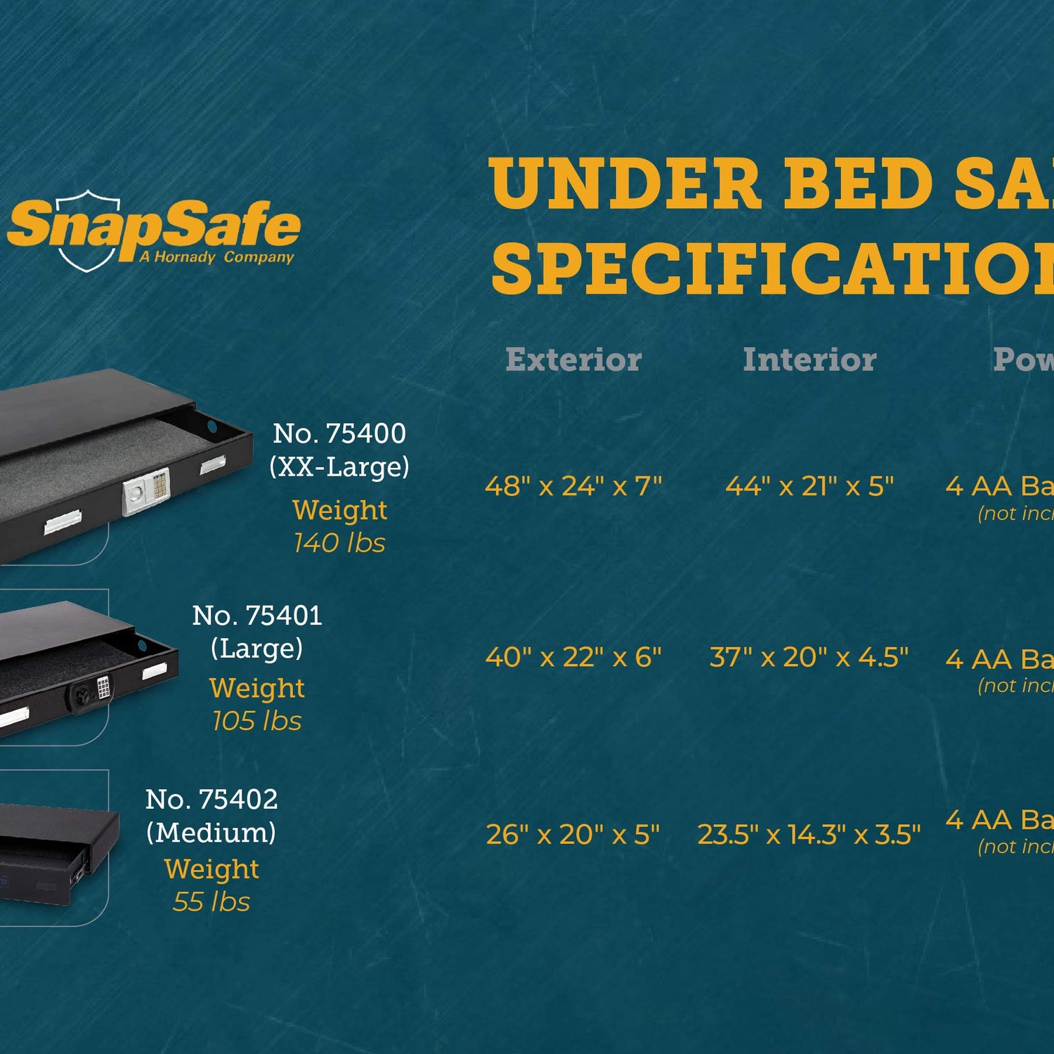 - SnapSafe Under Bed Safe – Store valuable belongings out of sight while retaining easy access. Open the large hidden safe using the digital lock (3 to 8 digit access code) or backup key
