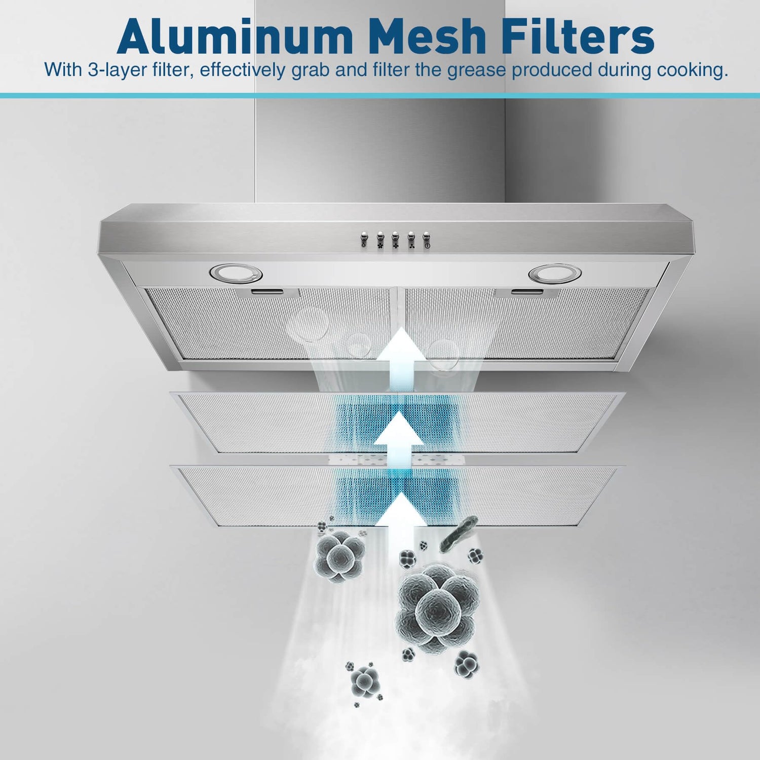 - 【Stainless Range Hood】A stainless steel range hood with brushed finish and smooth surface,stylish and nice-looking,simply use a towel with water to clean day-to-day,saving your time.2 aluminum mesh filters are included in this vent hood,are not easily corroded,hand washing or dishwasher safely cleaning are both acceptable