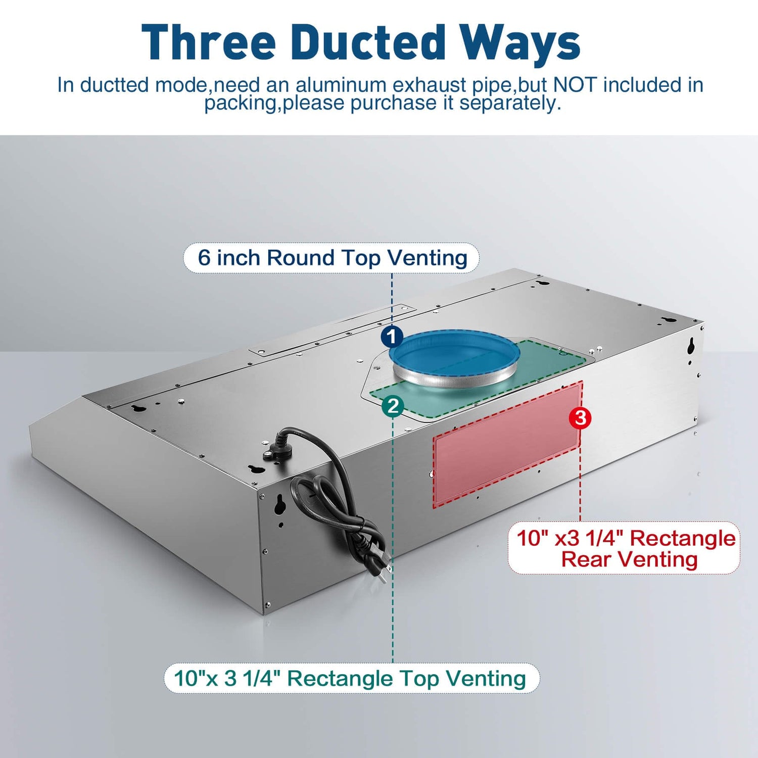 - 【3 Venting Outlets Available】The kitchen exhaust hood with 3 ducted outlets,6" round or 10x3 1/4" rectangle in the top,10x3 1/4" rectangle in the back,.Top installation and rear installation for optional,choose a suitable venting way to install the ducted range hood as your kitchen design and request