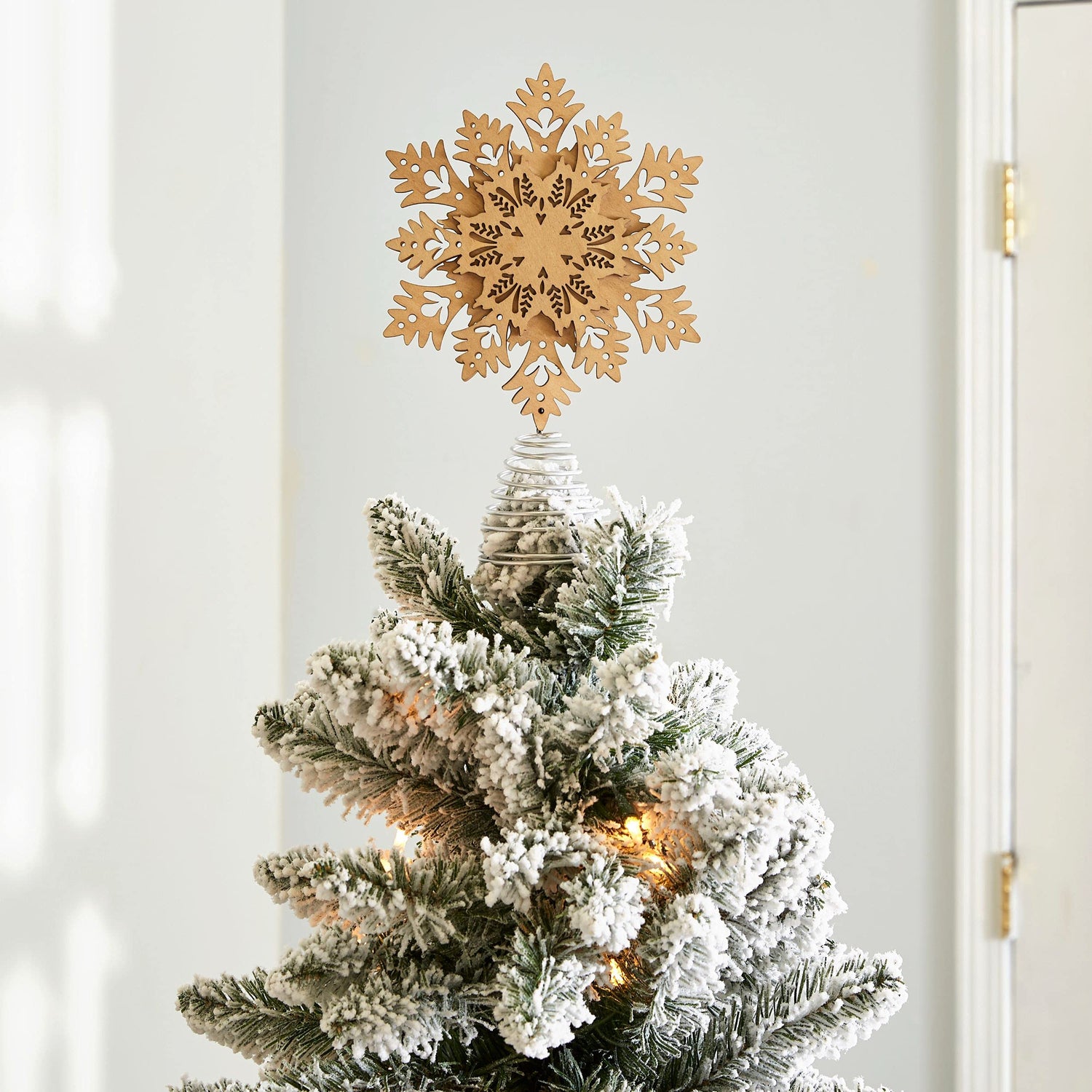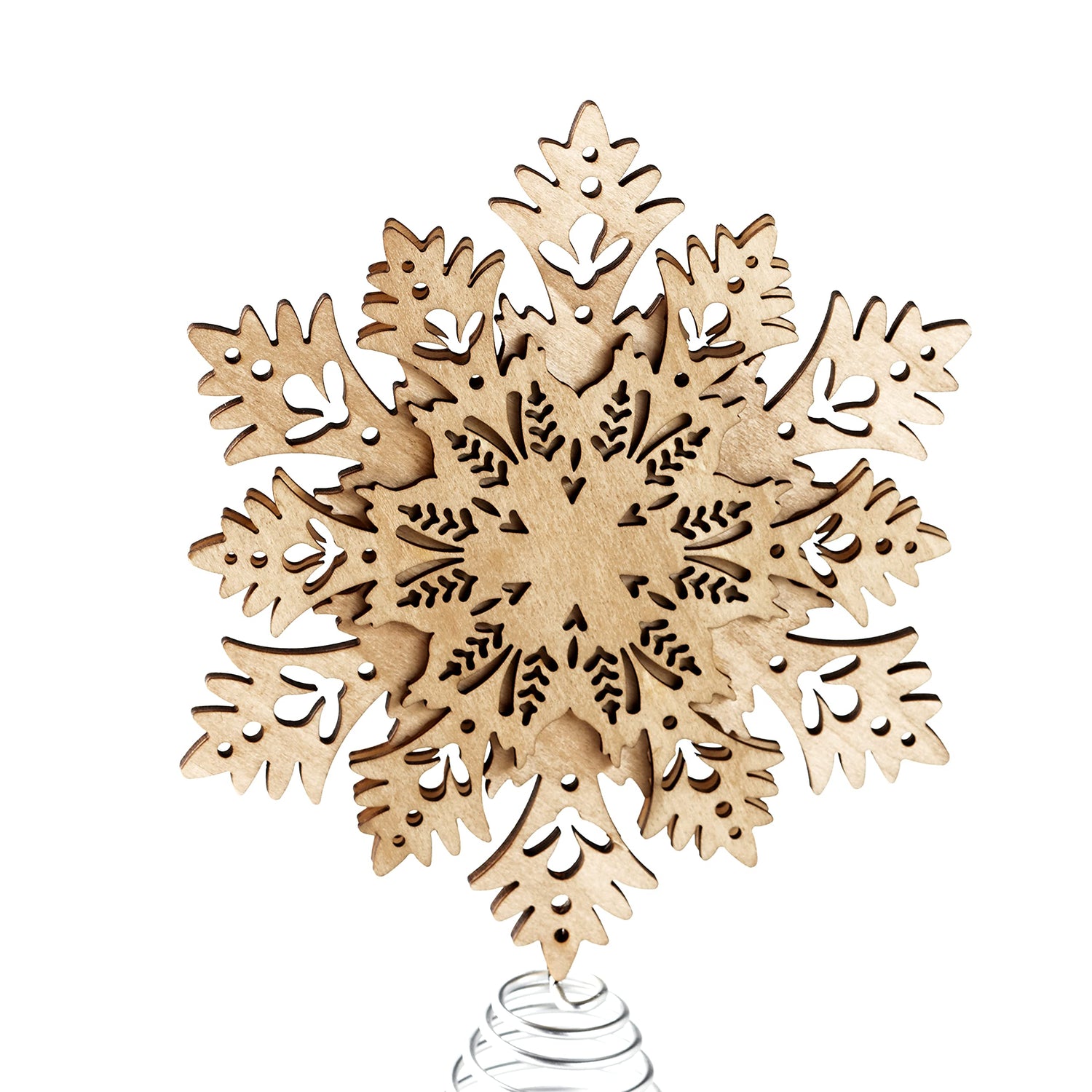 - Enhance your Christmas decorations with this wooden snowflake tree topper. It will add a beautiful finishing touch to your Christmas tree and holiday indoor décor.