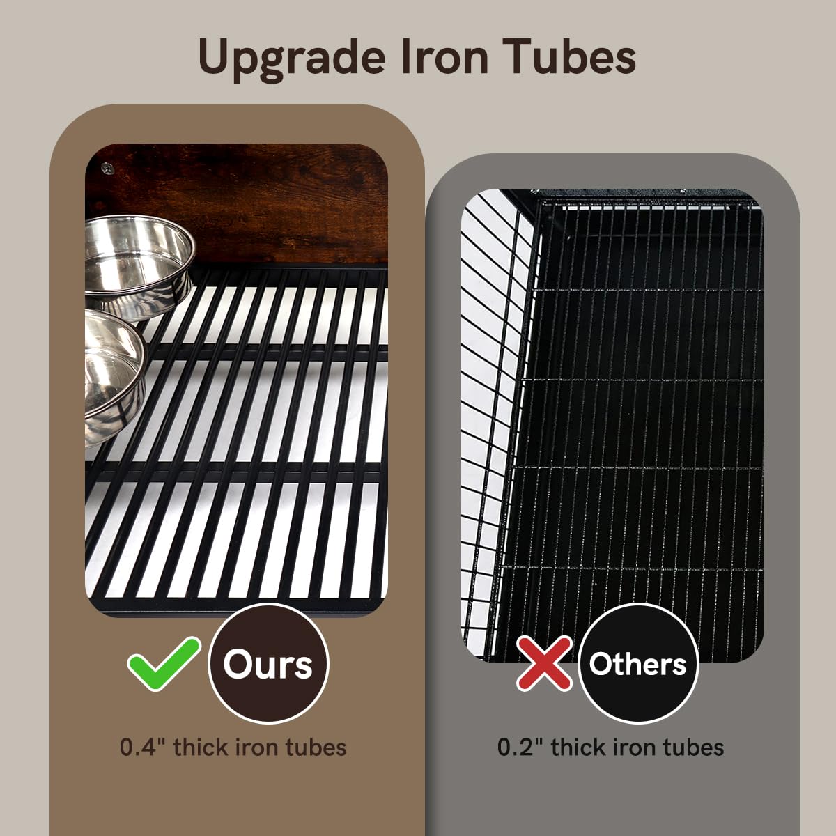 - 【Sturdy and Reliable】This furniture style dog crate is made of high quality high density fibreboard and iron, 0.2 inches thick iron mesh enhances chewing resistance; 0.4inch thick iron pipe on the bottom adds more static load-bearing capacity to provide stable support for your pet dog. The wood grain adds a modern touch that can be incorporated into any home décor.