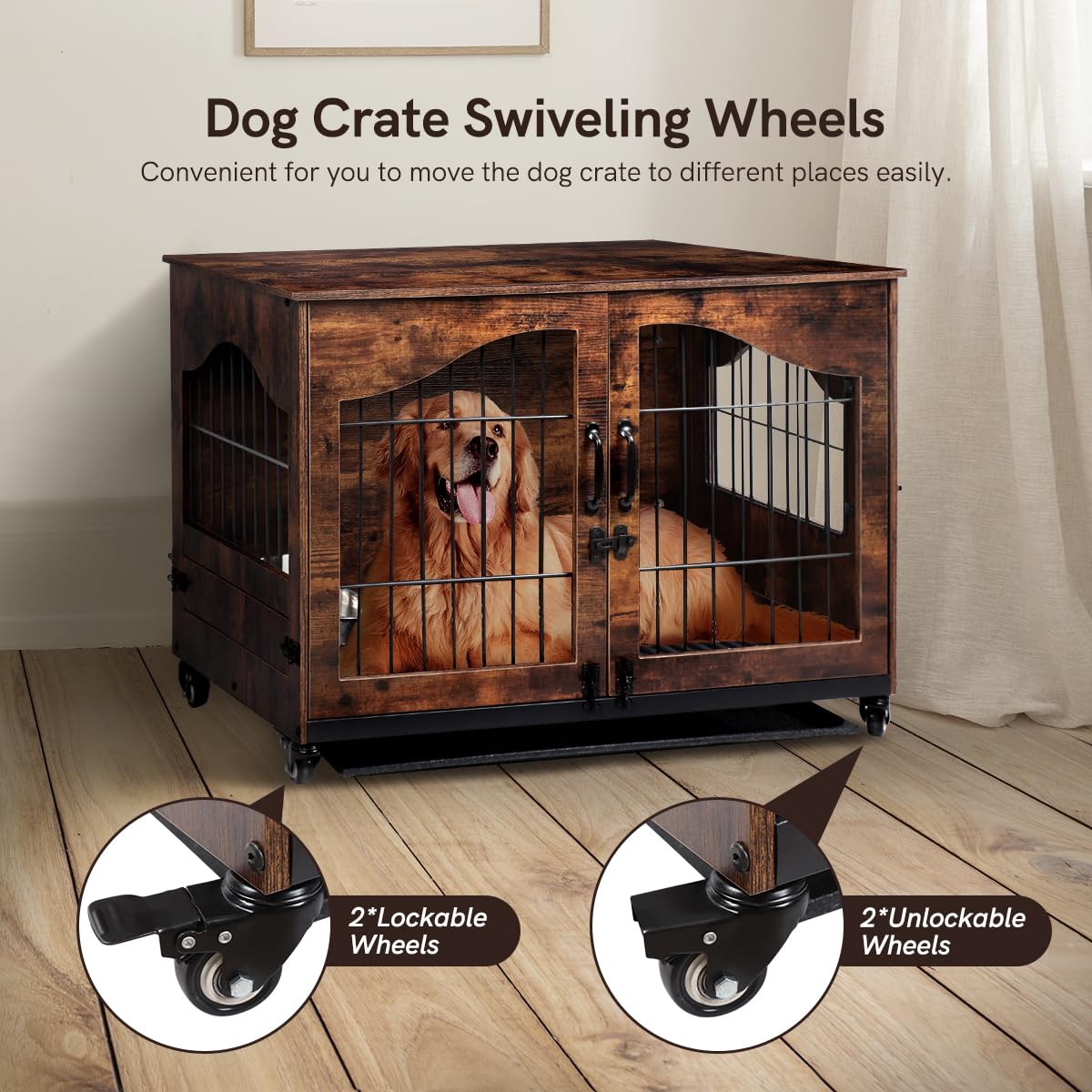 - 【360° Swivel Feeder & Wheels】The furniture dog kennel indoor comes with a 360° swivel dog bowl holder, 2 x 800ml food-grade stainless steel dog bowls for daily feeding without opening the door. You can fix the two dog bowls inside or outside the dog crate as neede. 4 x 360° rolling wheels allow you to move the dog kennel furniture around your home with ease, 2 of the wheels can be locked to keep it firmly in place.