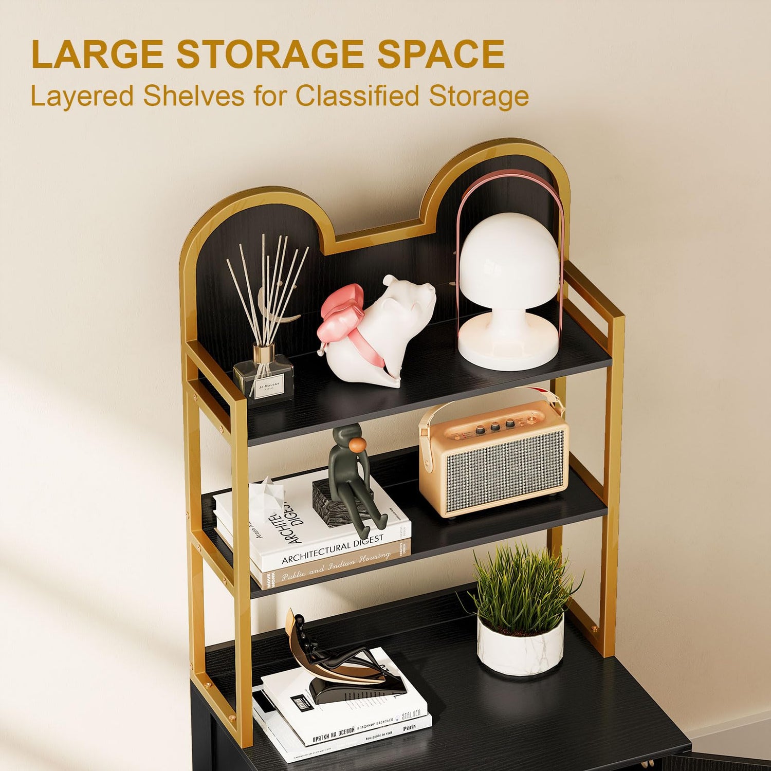 - 【Elegant Fashion】: The black cat head design on top adds a sense of liveliness and fun to the entire shelf, while the minimalist lines paired with a gold frame and black body allow it to blend with various home styles and complement different home decors. Additionally, its compact shape saves space, making it suitable for living room, bedroom, hallway, or corner. Overall dimensions are 23.62''L x 17.72''W x 53.94''H; internal available space is 22.44''L x 16.93''W x 16.73''H.