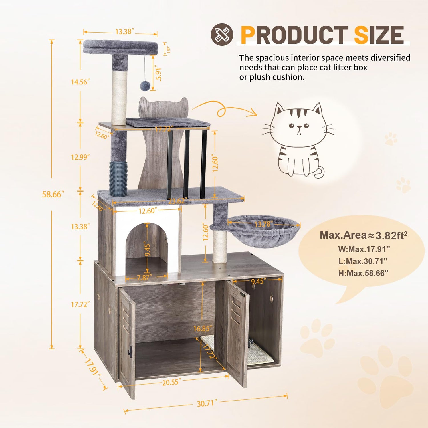 Snughome Cat Tree with Litter Box Enclosure Furniture, 2-in-1 Modern Cat Tower for Indoor Cats, 58.66’’ Wood Cat Condo with Scratching Post and Hammock, Indoor Cat Furniture with Large Platform, Grey