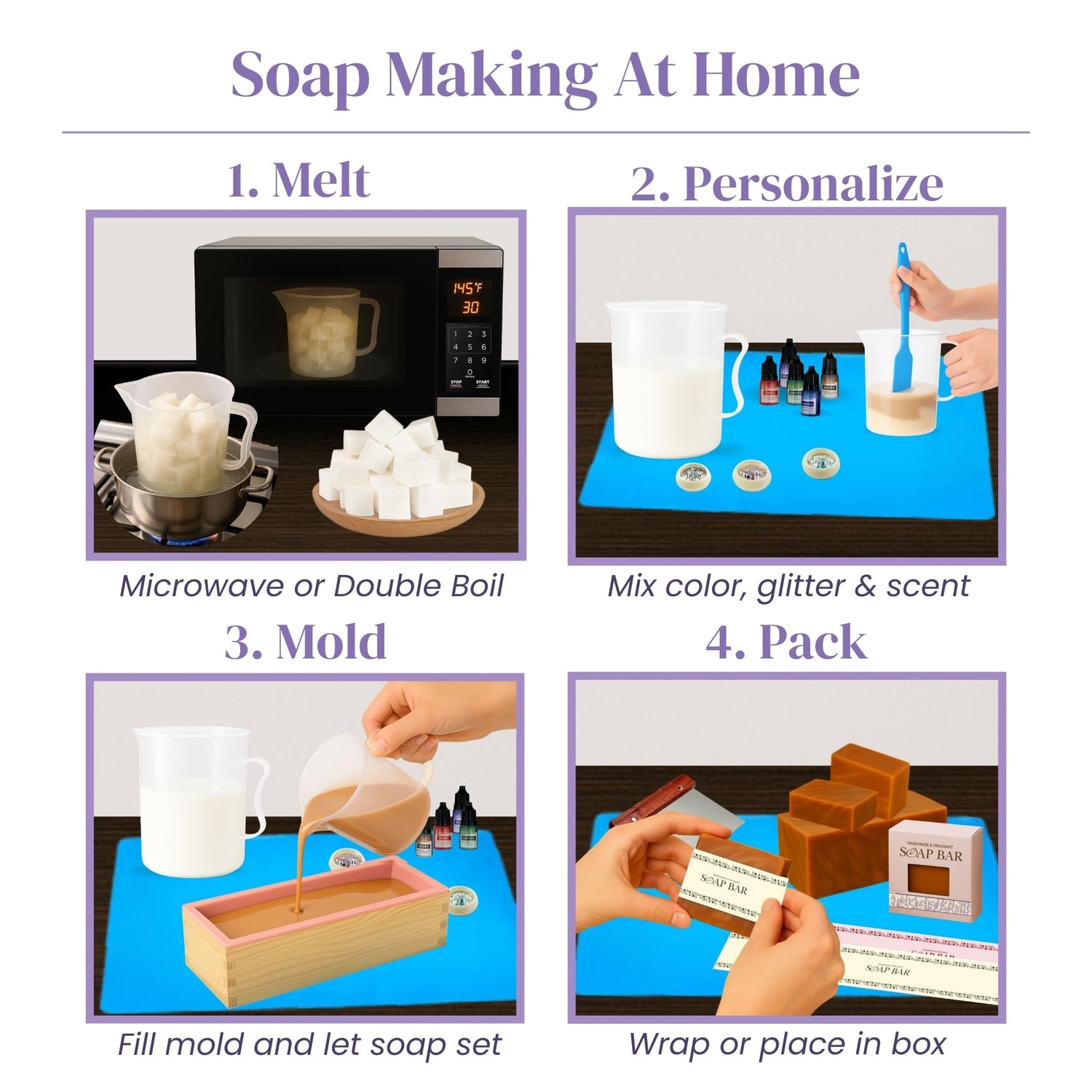 - MESS-FREE, SAFE AND CONVENIENT CRAFTING AT HOME - Craft safely and mess-free with silicone mat and gloves. Melt and mix conveniently with 1L and 300ml pitchers, silicone and wood mixing tools. So just focus on the crafting and seize the moment whether you're starting a new hobby, simply want to be productive in a boring afternoon, or unwind and de-stress, our soap making kits is the perfect choice for a relaxing and rewarding way to create beautiful, useful soaps.