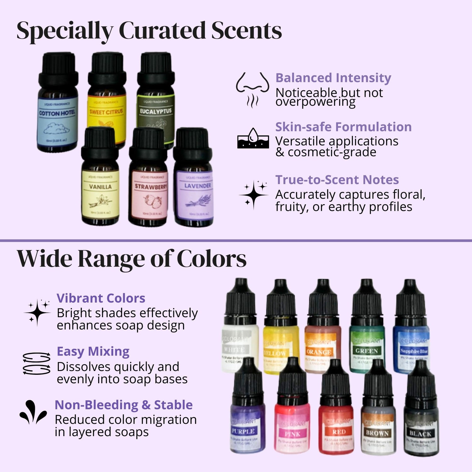 - MORE CREATIVE RESULTS & FUN EXPERIENCE - Enjoy exploring the crafting experience with variety of molds and decorative items! Donut mold for a creative fun shape, Mandala mold and rose loaf mold to try working with texture, while plain loaf and square mold for a simple basic shape. Even comes with crinkle and straight soap slicer for varying soap bar finish. Personalize using 6 carefully curated pleasant scents and 12 liquid pigments, and decorate with some Lavender to experience working with botanicals and play around with colorful mica glitters for a unique creative finish.