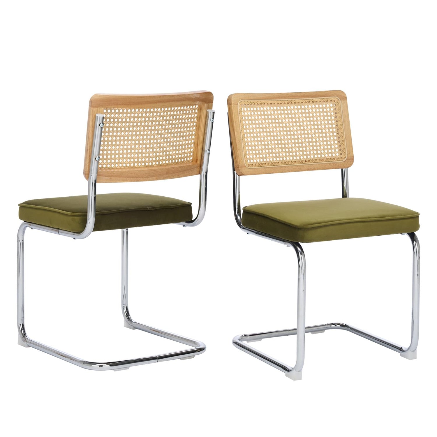 SOARMOTE Rattan Dining Chairs Set of 2,Upholstered Mid-Century Modern Dining Room Chairs with Cane Backrest,Retro Velvet Kitchen Chairs with Stainless Chrome Base,Green