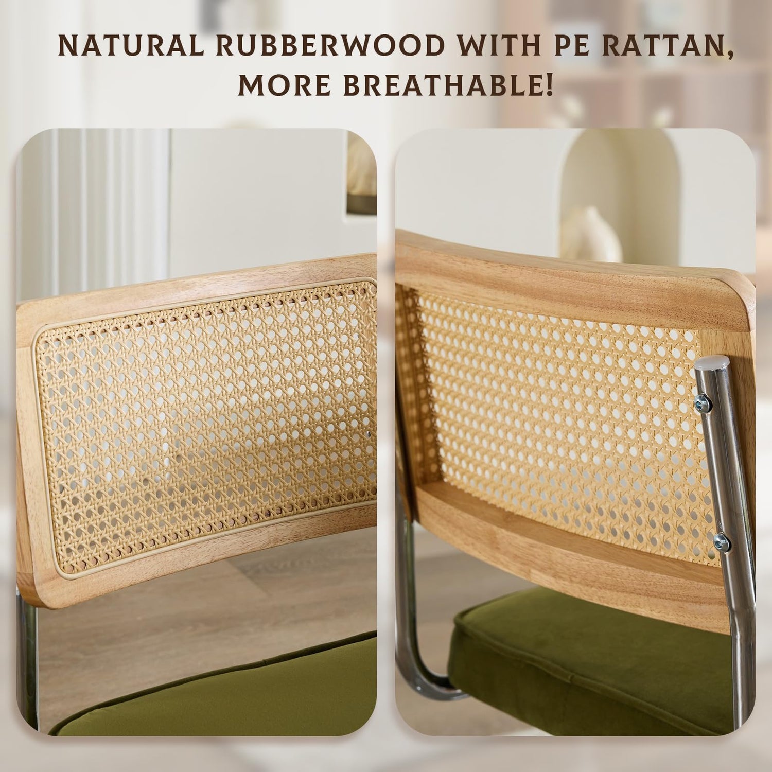- Ergonomic Rattan Backrest: Featuring a stylish combination of rubberwood and PE rattan, the curved backrest promotes breathability while following the spine’s natural curve. This thoughtful design provides exceptional support and relieves back strain during meals or relaxation.