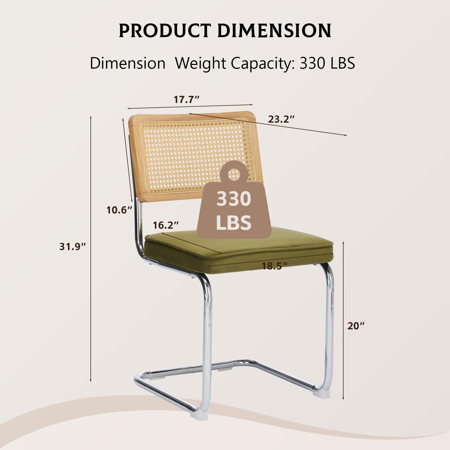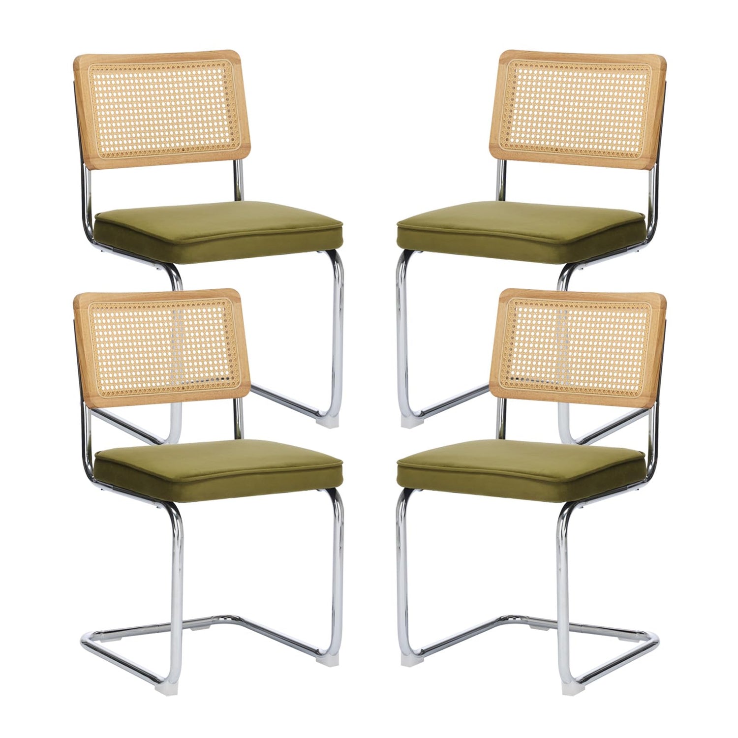 SOARMOTE Rattan Dining Chairs Set of 4,Upholstered Mid-Century Modern Dining Room Chairs with Cane Backrest,Retro Velvet Kitchen Chairs with Stainless Chrome Base,Green