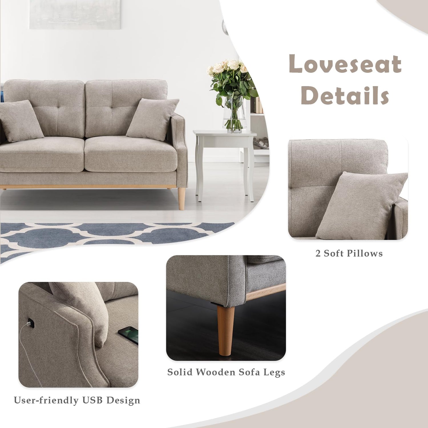 SoarTalent 56.7" Loveseat Sofa Small Couch Fabric Upholstered 2-Seat Sofa with USB Port for Small Place, Apartment, Living Room,Office(Light Grey)