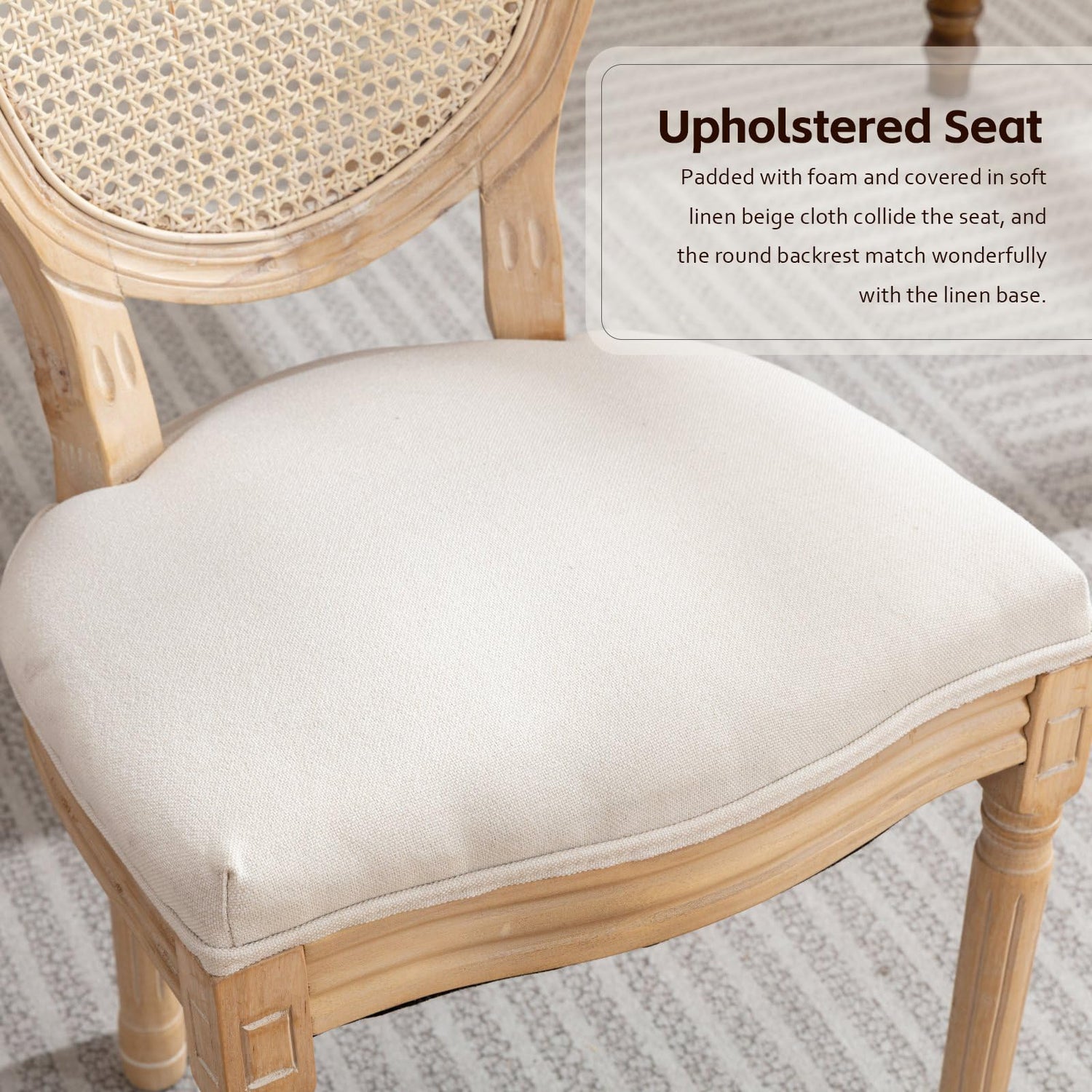 • 🍞【Mid-Century Dining Chairs】: Our dining chairs have an overall simple design, the backrest is different from the common rectangular backrest, and our dining chairs are oval backrest. The backrest material is divided into three kinds - linen, rattan, and PU leather material. The leg lines use exquisite carving technology to make the dining chair look more design sense.