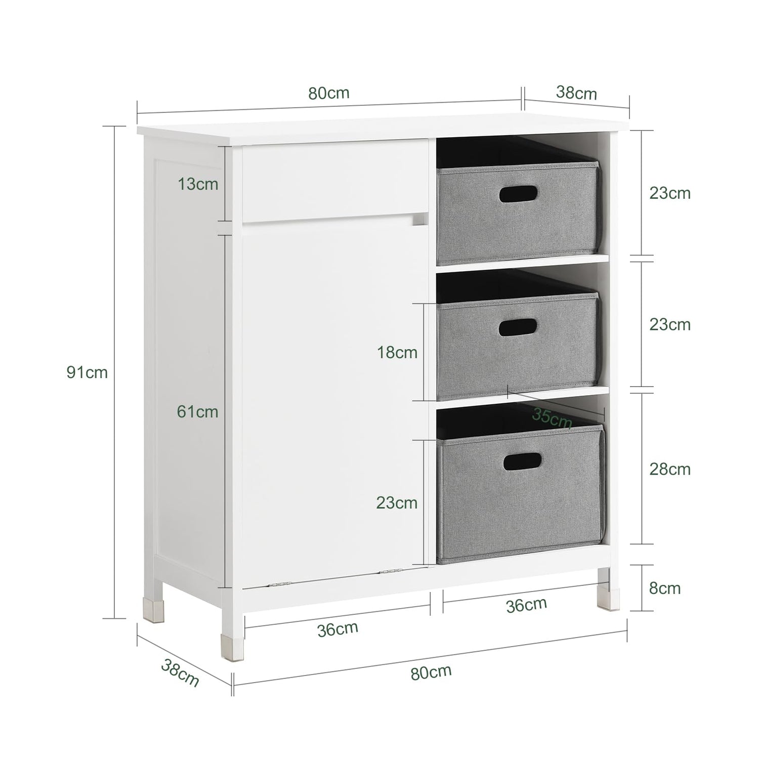 - [Modern Style Laundry Chest]: This laundry cabinet has 4 removable baskets. Modern design bathroom cabinet features a drawer, 3 fabric baskets and a cupboard with concealed laundry basket.