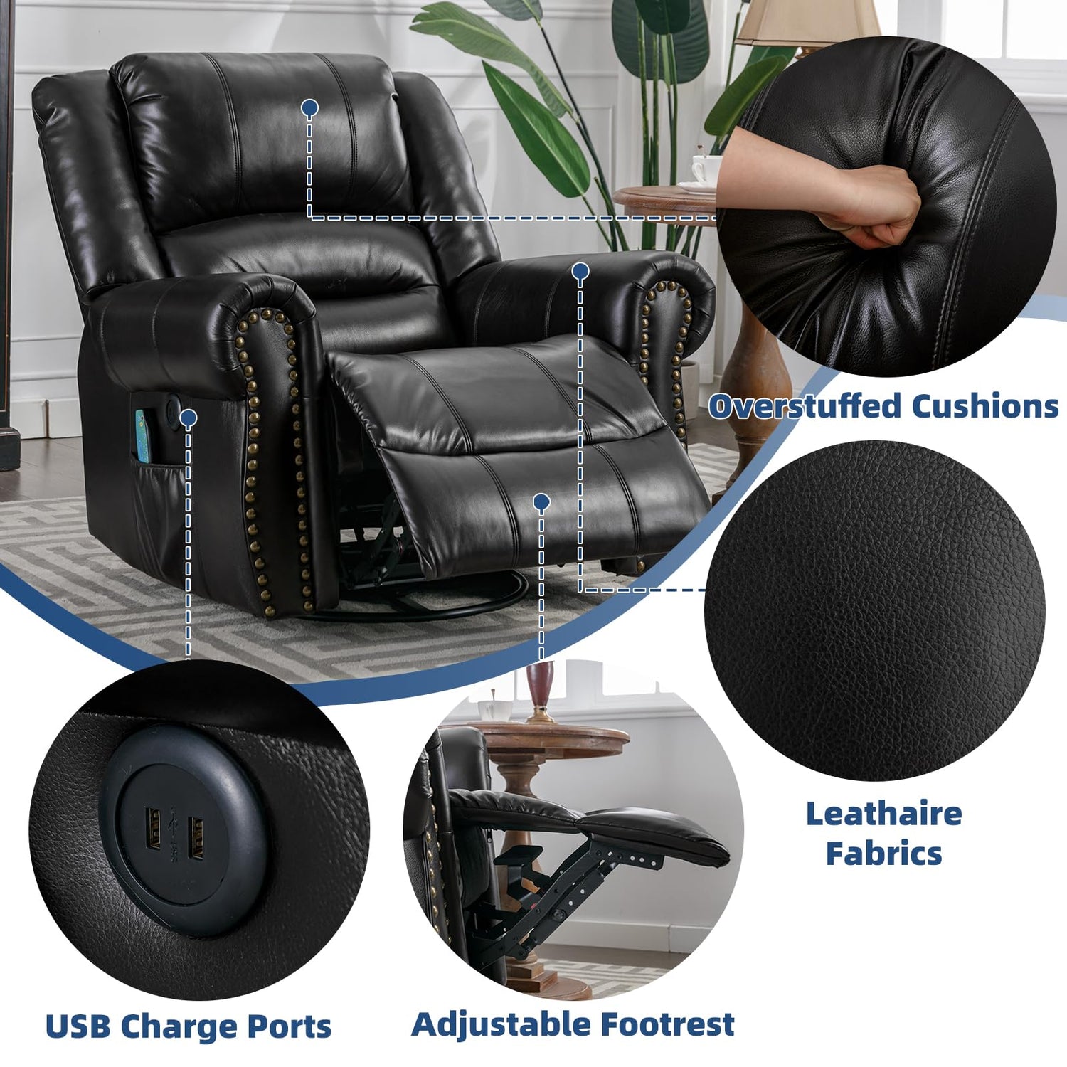 SOCIALCOMFY Swivel Rocker Recliner Chair with Heat and Vibration, 360° Swivel Glider Rocker Manual Reclining Chair, Massage Rocking Recliners with Side Pockets & USB Ports for Living Room, Black