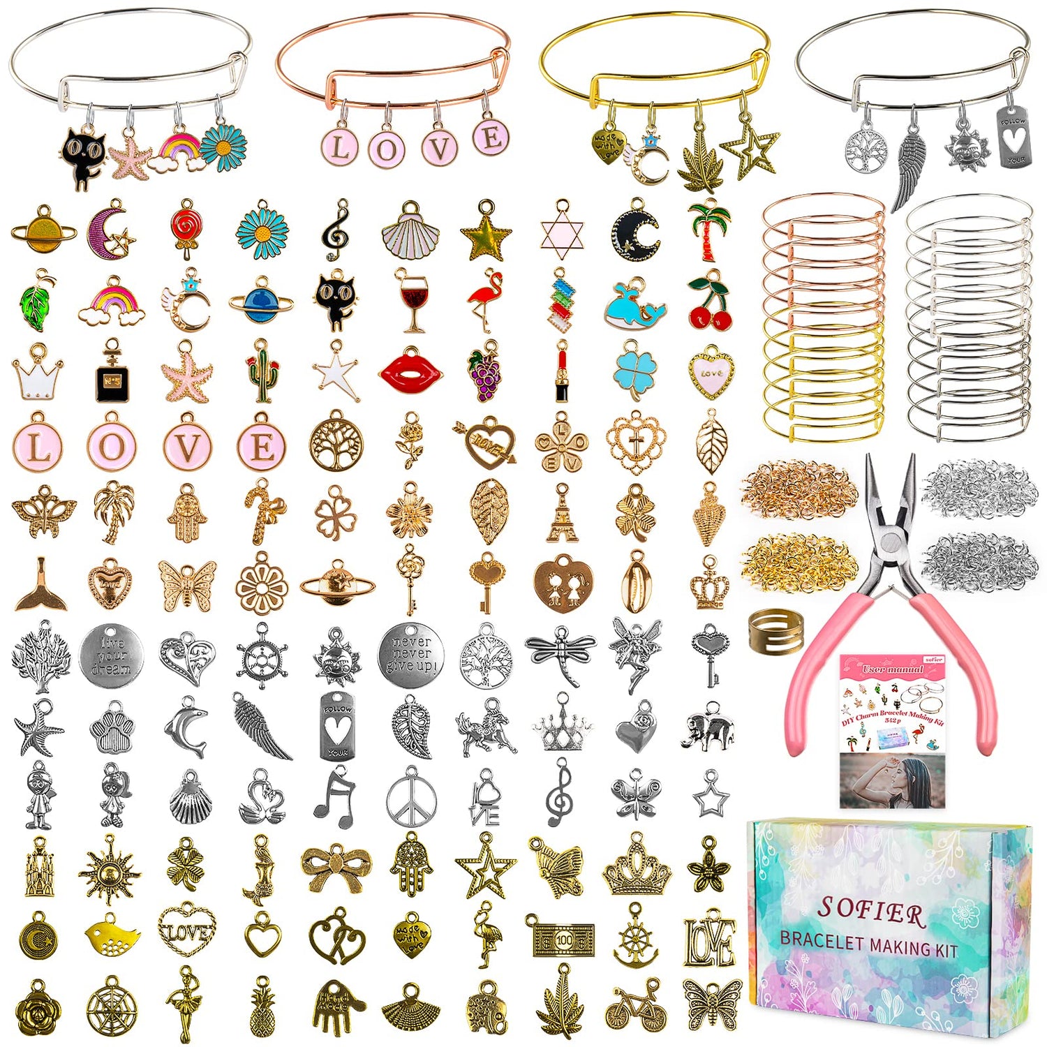 - 【PACKAGE INCLUDE】Our DIY bangle bracelet making kit includes 20Pcs adjustable expandable bangles(4 colors),30pcs colorful charms for jewelry making and 90pcs metal assorted shapes charms(sliver*30,gold*30,rose gold*30), 400pcs jump rings(4 colors),1pc jewelry pliers, 1pc jump ring,1pc lovely gift box and 1pc user manual.Gread teen girl trendy gift.