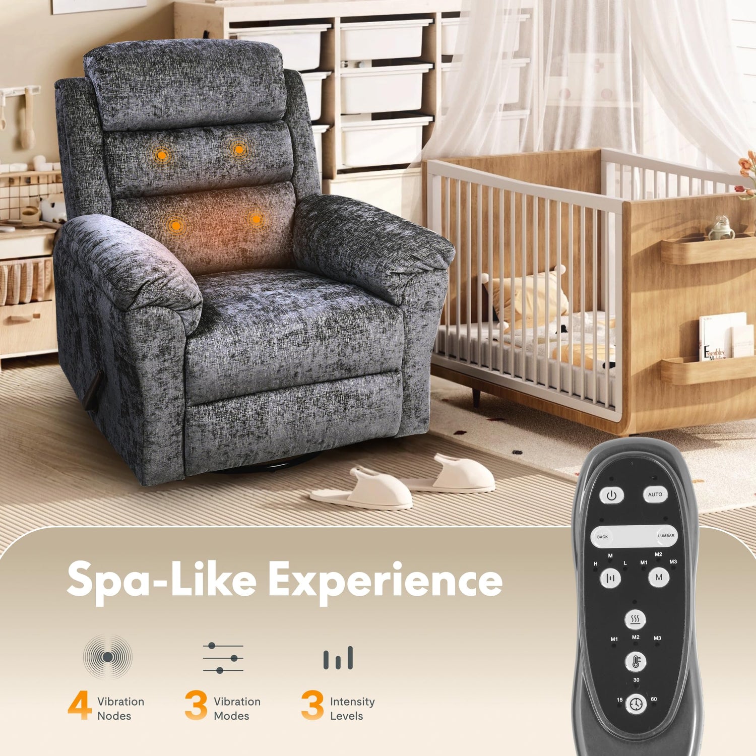 - 【Full-Body Relaxation】– 4 vibration nodes in the upper back deliver gentle massages to ease tension, paired with lumbar heating to improve circulation—ideal for nursing parents or post-work recovery. Note: Leg massage not included. The premium chenille fabric stays breathable even during extended use, resisting pet hair and stains.