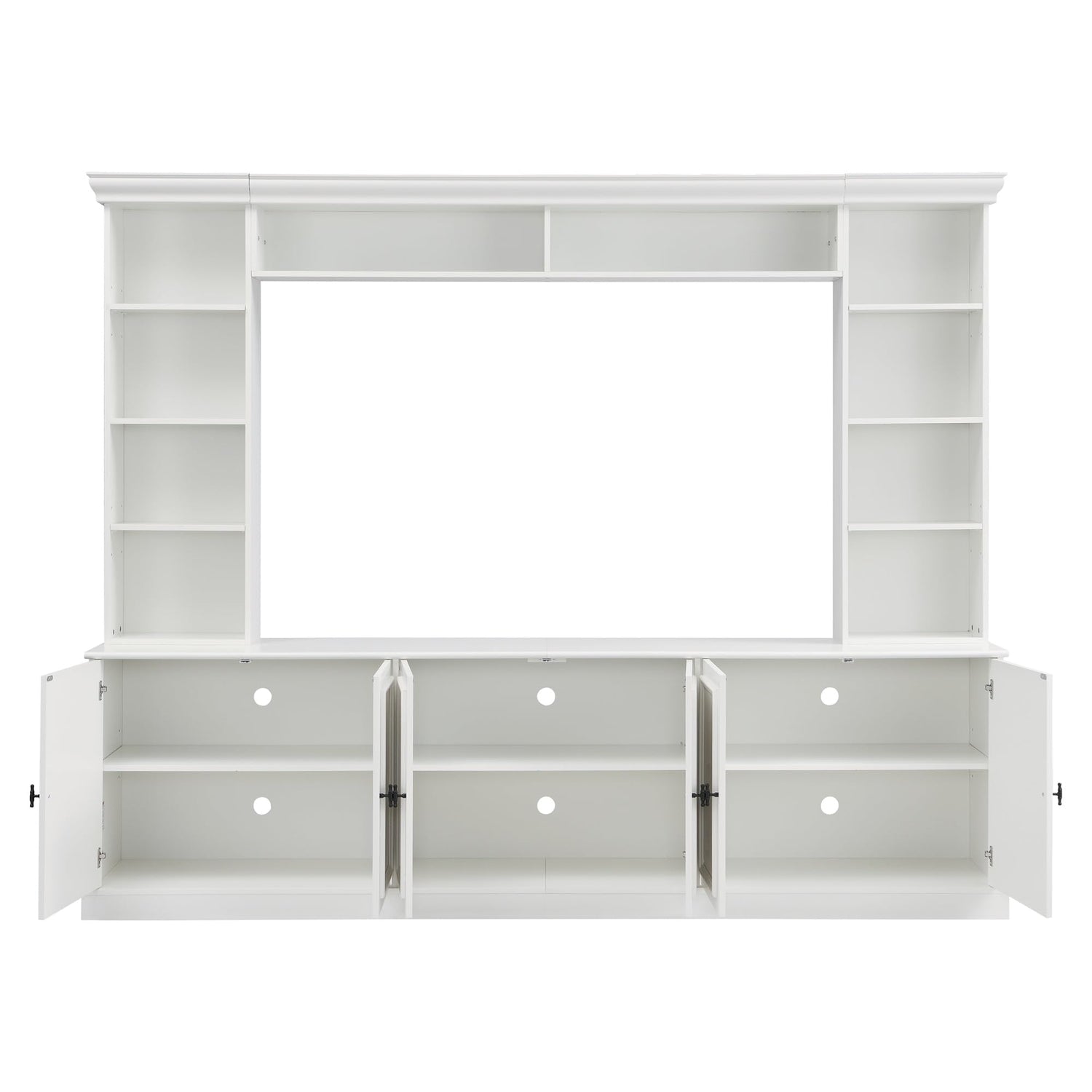 - [Diverse Storage Space]: This wall entertainment unit features 6 doors, open shelves and 3 cabinets. Includes 7 adjustable shelves in total. Simply align the shelves with the pre-drilled holes to customize your storage space Easily accommodate various electronic devices and display collectibles.