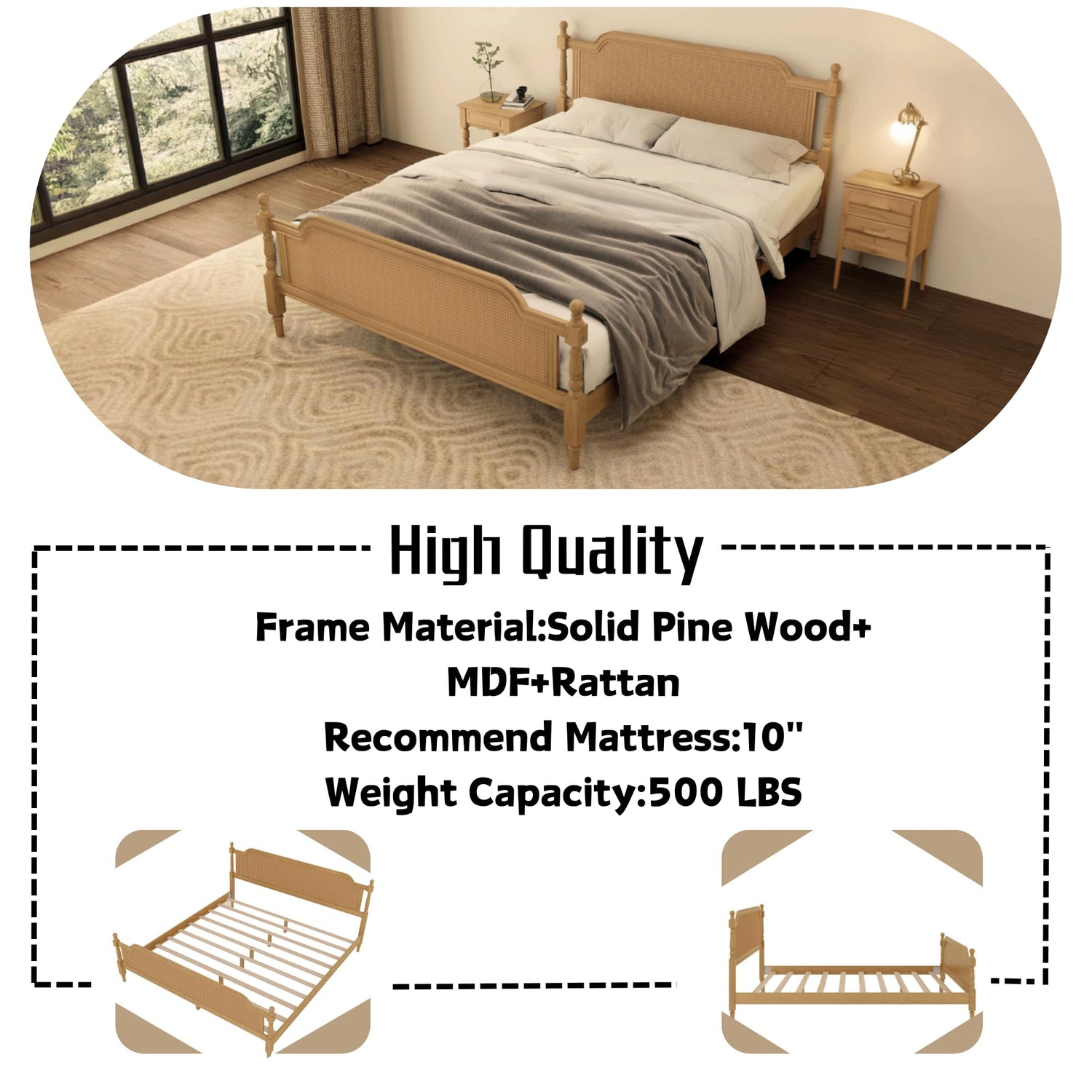 - Rattan Platform: This boho style bed frame showcases a charming rattan headboard that highlights the natural texture and color of rattan, adding a unique beauty to the bed frame.