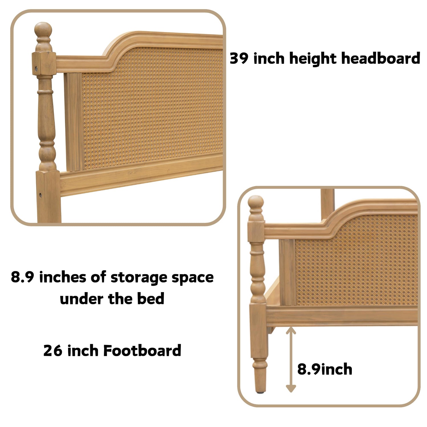 SOFTSEA Framhouse King Size Platform Bed with Rattan Headboard and Footboard, Traditional Bed Frame with Storage for Teens Adults, Antique Walnut