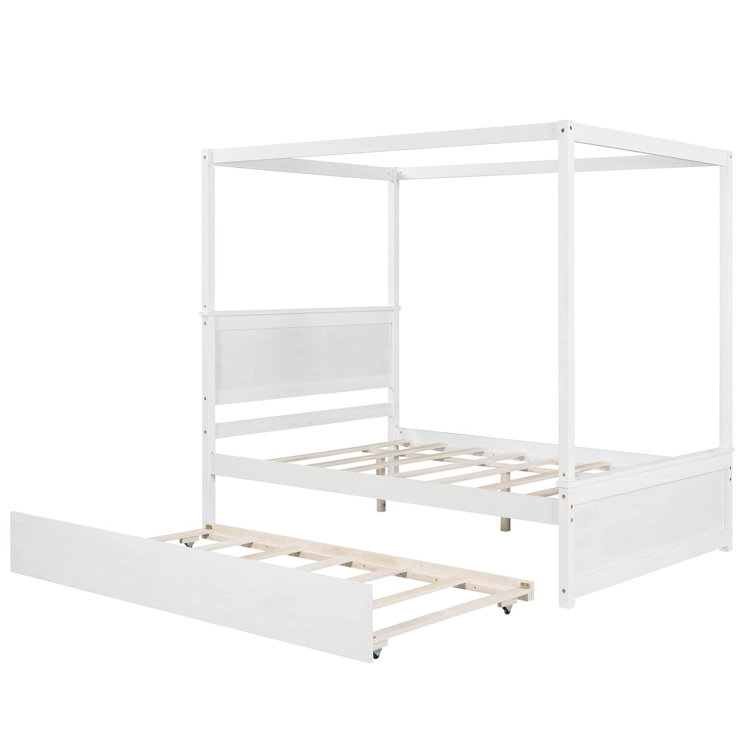 SOFTSEA Full Size Canopy Bed Frame with Trundle, Solid Wood Bed Frame with Headboard for Bedroom, No Box Spring Needed, White