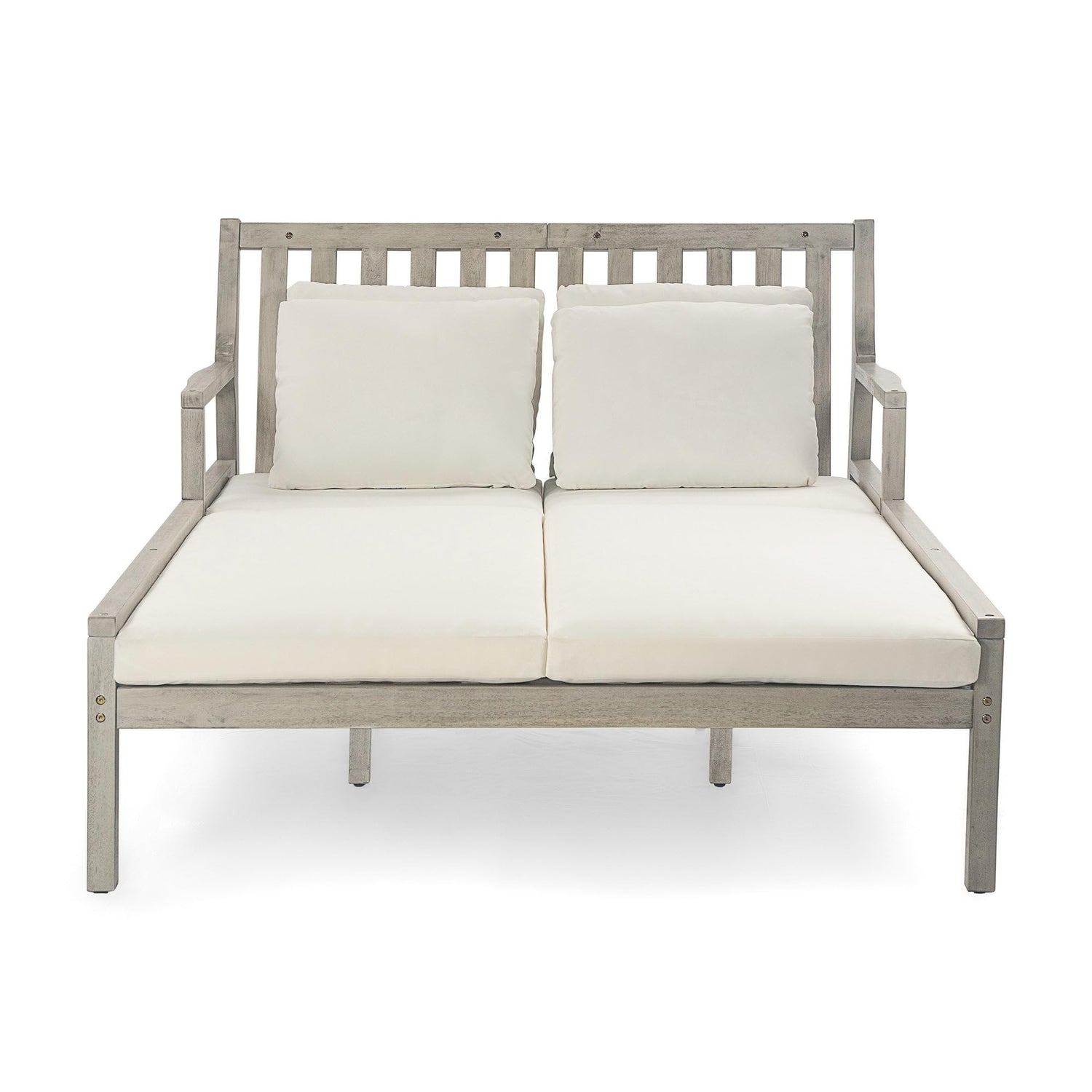 SOFTSEA Outdoor Daybed with Backrest and Cushions, Patio Daybed with Four Pillows, Wooden Outdoor Bed with Curved Armrests for Yard Pool Backyard, Gray+Beige Cushion