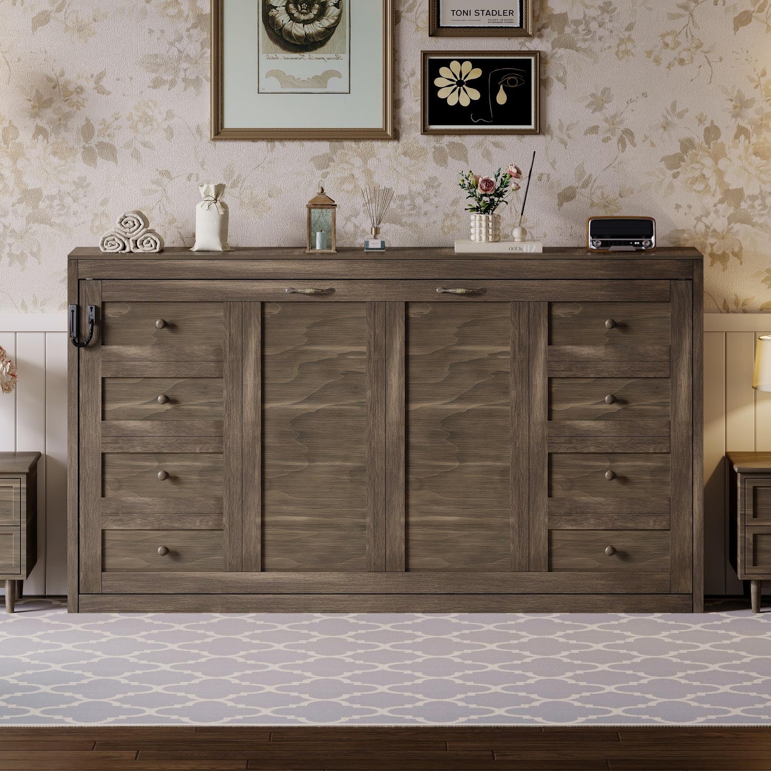 SOFTSEA Twin Size Murphy Bed with LED Light, Rustic Hidden Wall Bed Frame with LED for Small Spaces, 2 in 1 Murphy Bed Cabinet, No Box Spring Needed, Brown